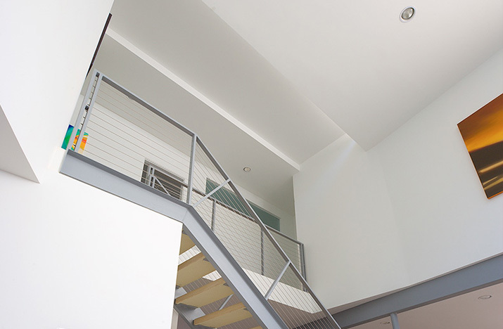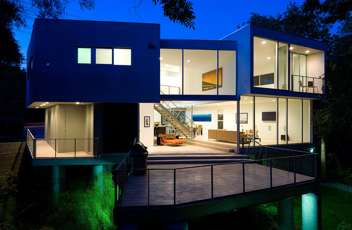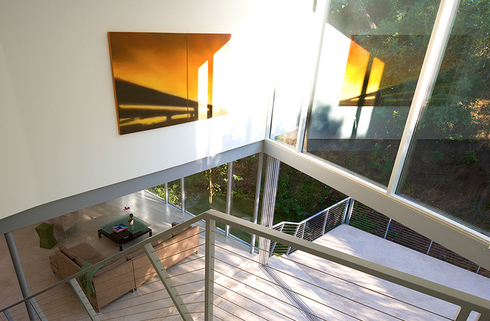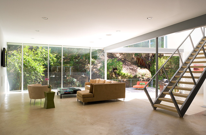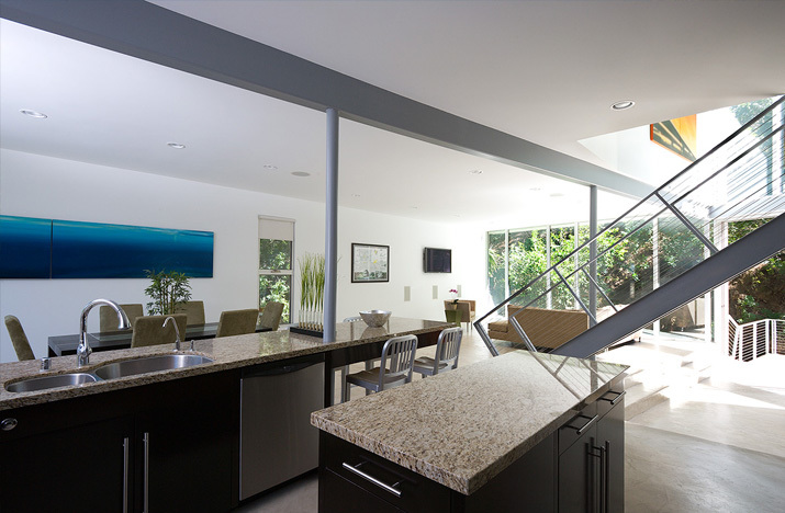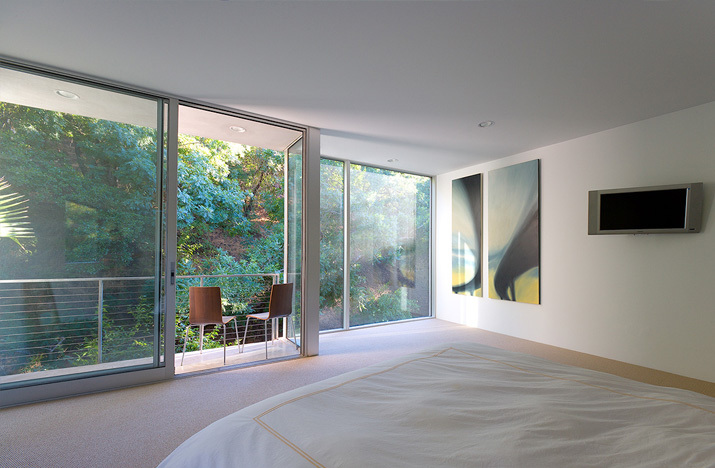 In negotiating the imposed location for the house, an inverted orientation emerged, turning away from the heavily trafficked street and towards the lush hillside and creek found within the property. The house was conceived as the interlocking of two concepts of dwelling, consisting of an opaque volume, screening the residents from the noise and intensity of Laurel Canyon Boulevard and a thin scrim of metal and glass, supporting a porous relationship between the interior spaces and the nature beyond. The house consists of a series of contiguous living spaces that open to the terrace, expanding the interior deep into the site and over the creek.