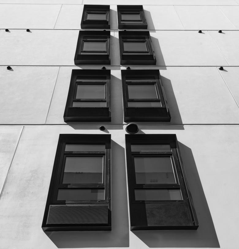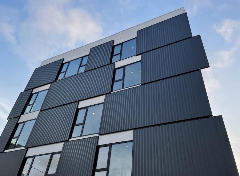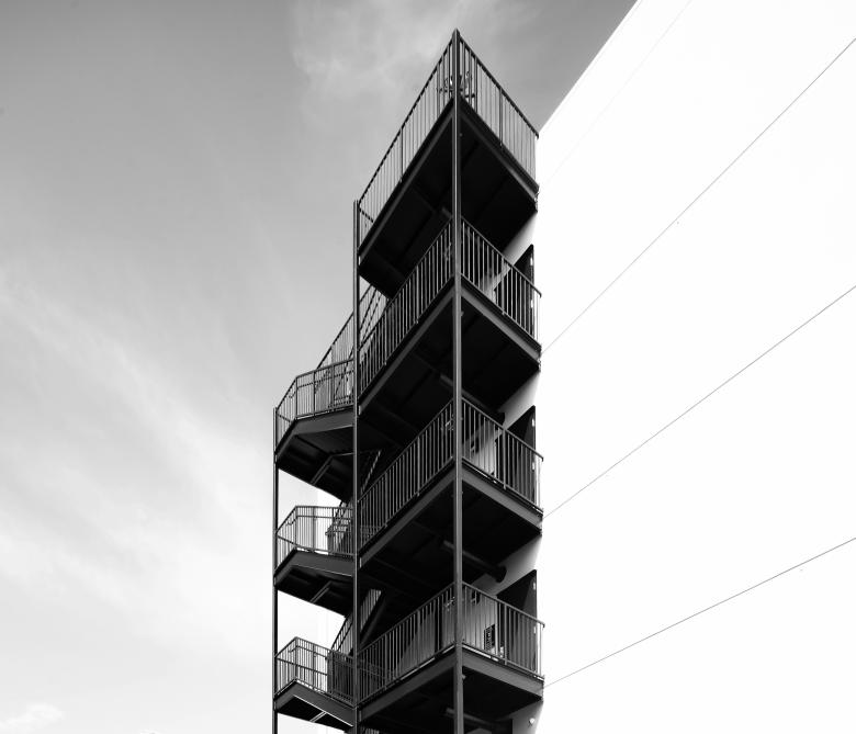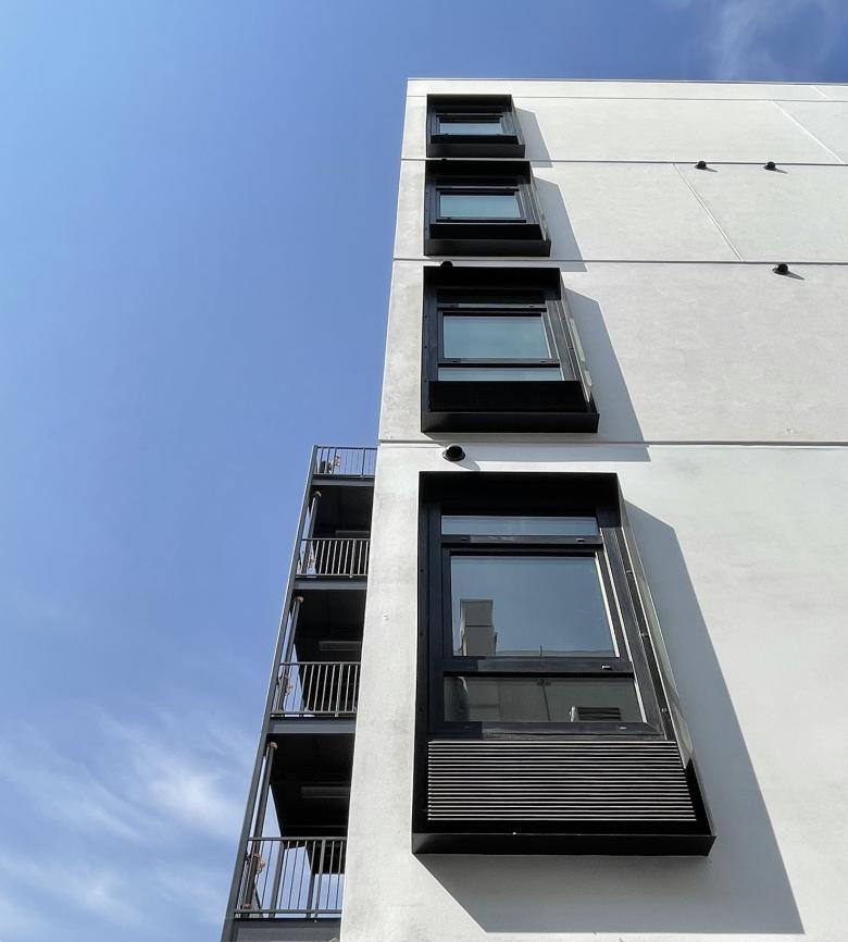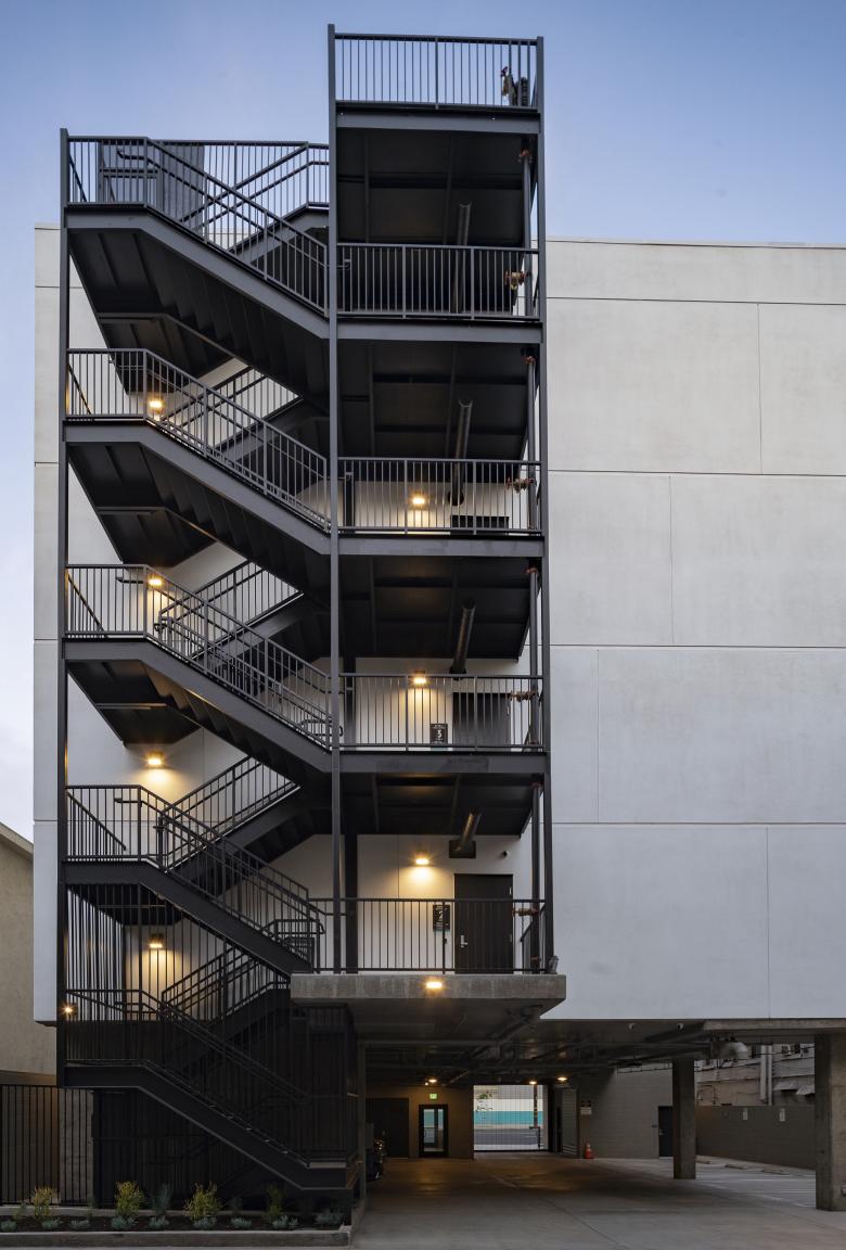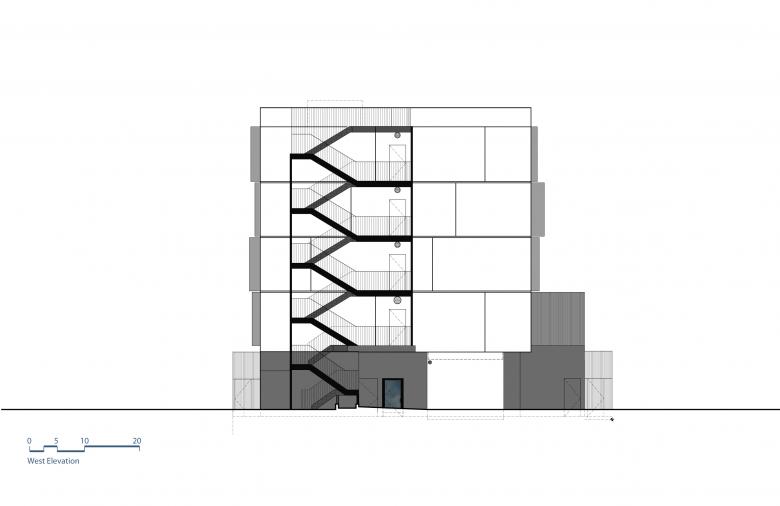 Deploying site constructed and modular building components, the resulting geometry and cladding expresses the cellular nature of the hotel’s interior spatial configuration, while sensitively engaging the existing scale of the street and the neighborhood. The front façade highlights the circulation, elevator landings, and lobby with an alternating pattern of reflective ribbed metal panels and floor to ceiling windows oriented towards distant mountain and skyscraper views. The side façade, a traced white canvas, is punctured by the guest room shadow box windows, creating a daily registration of the sun’s path. The rear façade holds a tectonically experiential egress stair, connecting the ground floor to the roof.