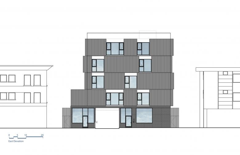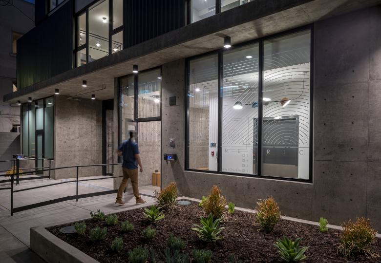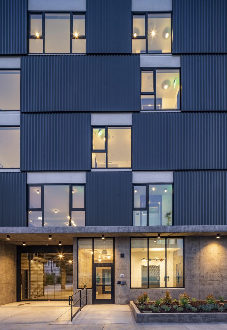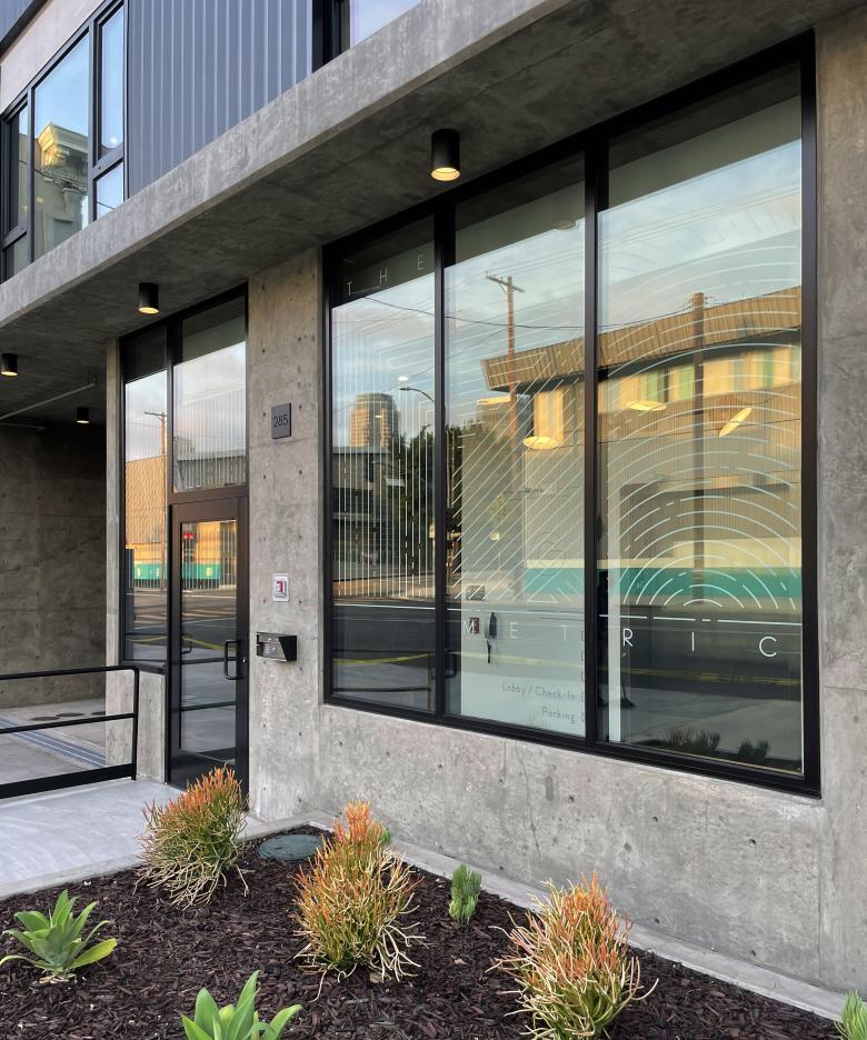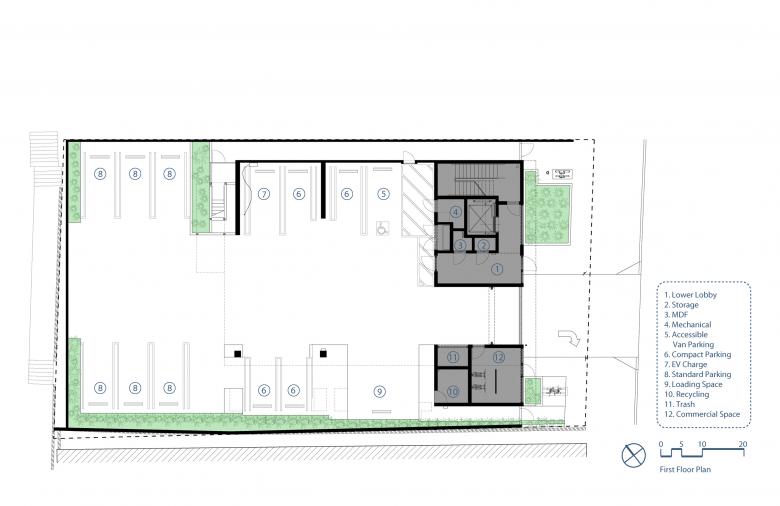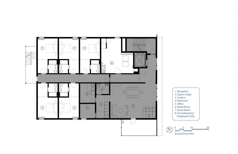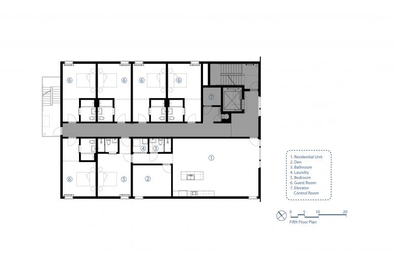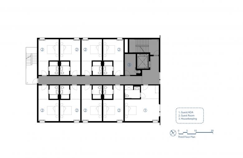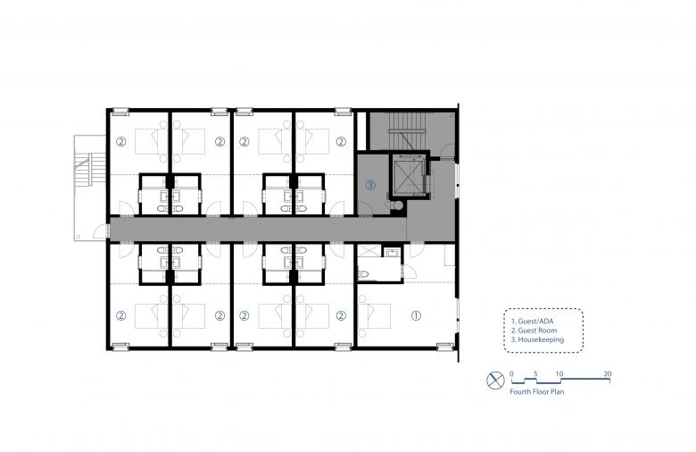 Situated behind the ground floor lobby and storefront, the street level contains parking, mechanical spaces, and storm water planters. The second floor holds the main lobby, lounge, dining area, and service rooms, as well as 6 guest rooms, the third and fourth floors hold 8 guest rooms, while the fifth floor has 6 guest rooms and the owners’ two bedroom suite on the top floor with commanding views of their neighborhood’s transformation.