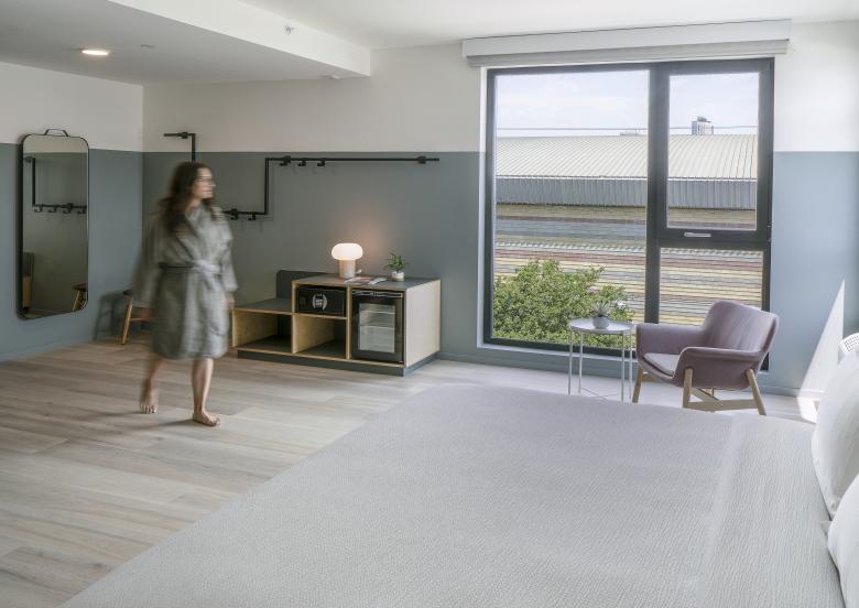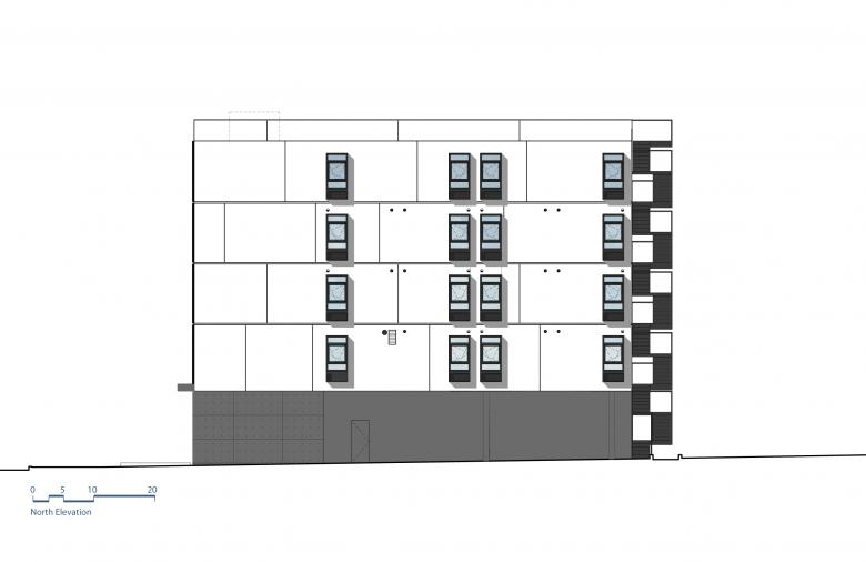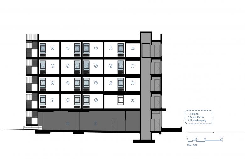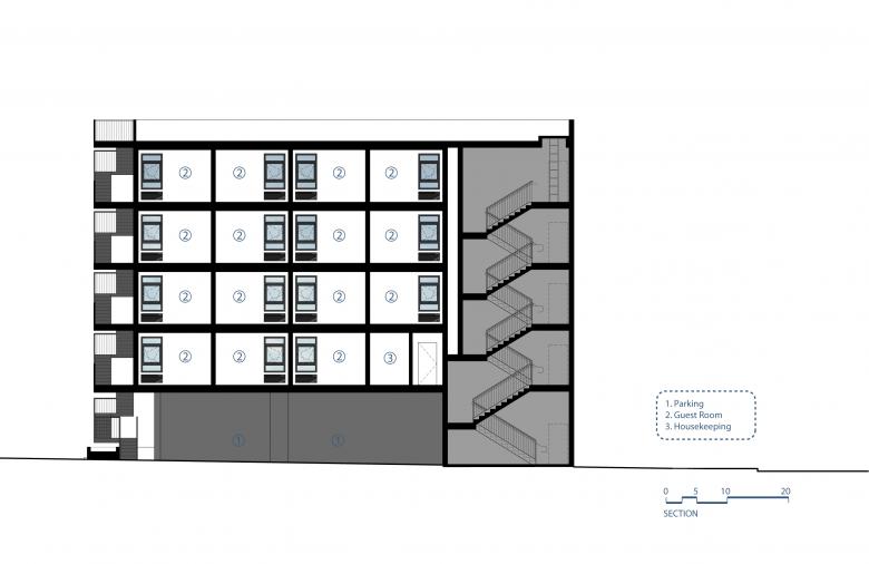 Conceived as an alternative to the corporate and luxury hotels proliferating downtown, and catering to young, foreign travelers, the hotel offers affordable comfort in a technologically current and efficient environment adjacent to transportation, business, art, sport, shopping, and adventure. With a focus on setting an example for inevitable future development, and keen to the dearth of public green spaces in the neighborhood, the hotel steps back from the street, providing a moment of pause for the residents with the introduction of a green space and a bicycle rental and repair storefront, in addition to the street level lobby.