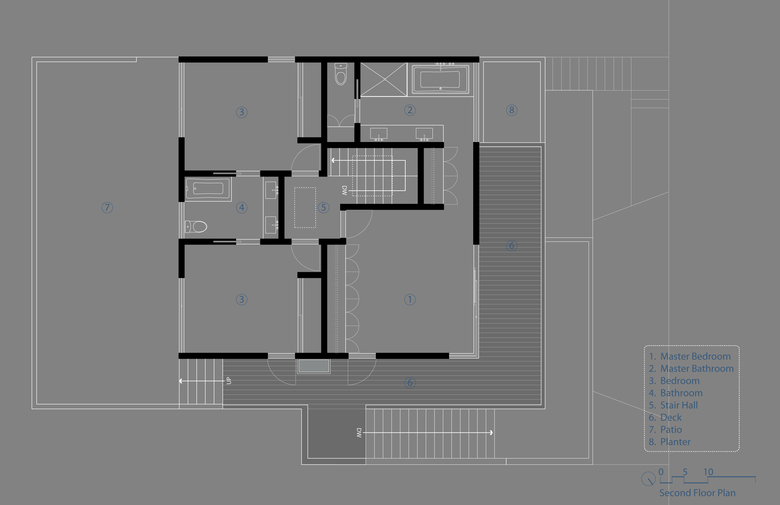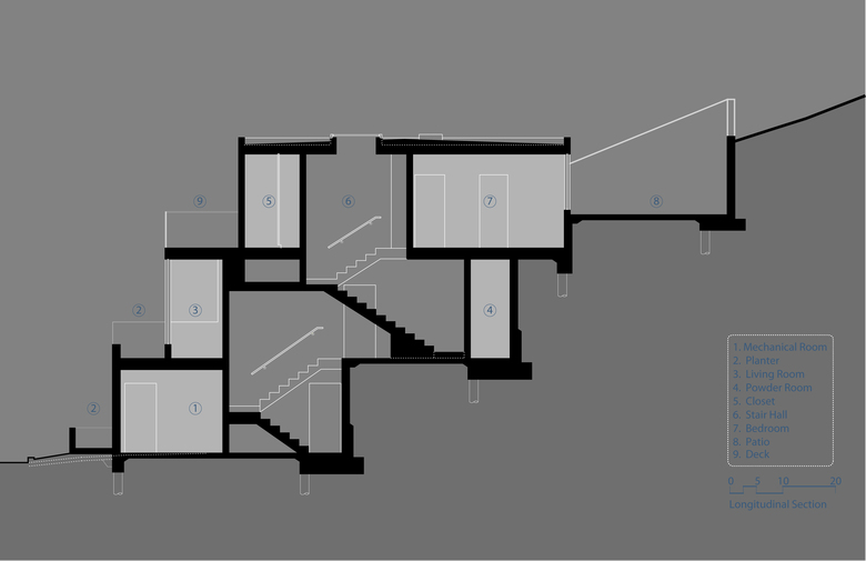Organized as a rigorously stacked and shifted volume of three levels, the house is situated upon a subterranean garage inserted into the hillside. The second floor, primarily an open plan of living spaces that engage the entry and street facing decks, perceptually expands the interior. The third floor, consisting of the bedrooms, is accessed by a double height interior stair volume that in conjunction with the operable windows and skylights, acts to naturally ventilate the residence and provide circulation to all floors. Strategically located apertures, exterior stairs, patios, and decks around the perimeter connect the home to the multiple and diverse landscapes of the site at every opportunity; these connections serve to expand the useable living space of the compact residence.