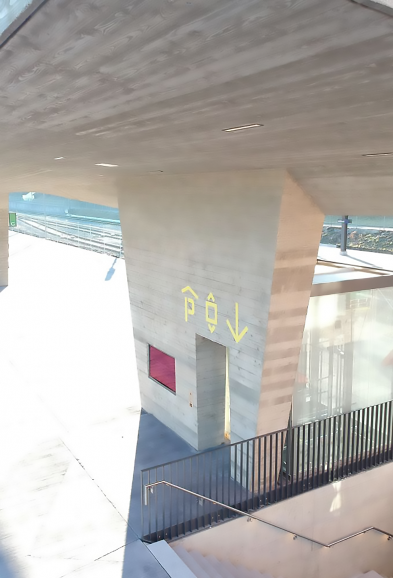 Die grosszügige und repräsentative Gestaltung des Bushofplatzes ermöglicht eine angenehme Koexistenz der vielfältigen Nutzungsansprüche von Bewegung und Aufenthalt durch Fussgänger, Velos und Busse. Ein einheitlicher Belag, Baumgruppen und das eigenständige Dach der Bushaltestelle prägen den neuen Platzraum. Mit seiner gefalteten Dachform strukturiert und positioniert es den Ort. Die Bretterschalung der Betonoberfläche folgt der Geometrie und unterstützt die Faltung – die ‹Wellen›.