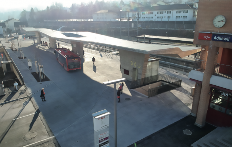 Der Bahnhof Adliswil ist ein wichtiger Knotenpunkt des öffentlichen Verkehrs. Zusammen mit dem neuen Bushof und der Erweiterung der Tiefgarage wird der neue Platz nicht nur zum attraktiven Ankunfts-, Abfahrts- und Umsteigeort, sondern zur Visitenkarte von Adliswil.