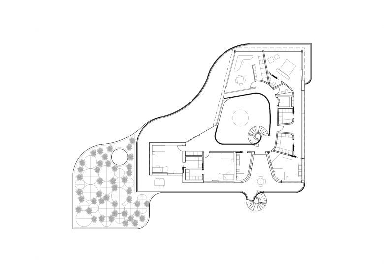 Vielfältige Durchblicke vereinen das Wohnerlebnis Innen und Aussen zu einem Ganzen. Im vom antiken Rom inspirierten gegen Süden angelegten atriumartigen, ruhigen, mit kleineren Bäumen beschatteten Sinnesgarten, erfreuen die Blumen- und Gewürzterrassen durch ihre Farben und ihre Düfte das Auge, die Nase und den Gaumen. Das mit einem geschwungenen, weit auskragenden Vordach überdachte Promenadendeck schlängelt sich entlang der Fassade und ermöglicht so den geschützten Aufenthalt in verschiedenen überdachten Bereichen im Aussenraum. Einzelne kreis-runde grosse Öffnungen spenden Licht und erzeugen interessante Lichtspiele.