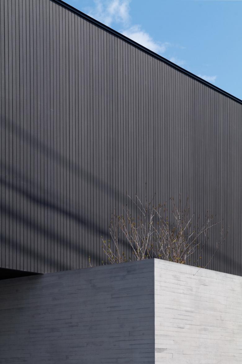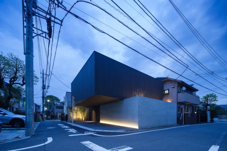 敷地は都心にほど近い閑静な住宅地。コンクリート打ち放しと樹脂木という二つの異なる素材のキューブがずれながら重なるアイコニックな外観が特徴的で、角地特有の景観を創出している。