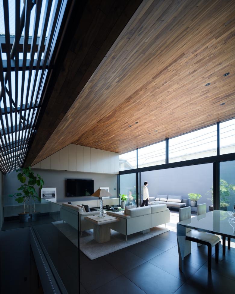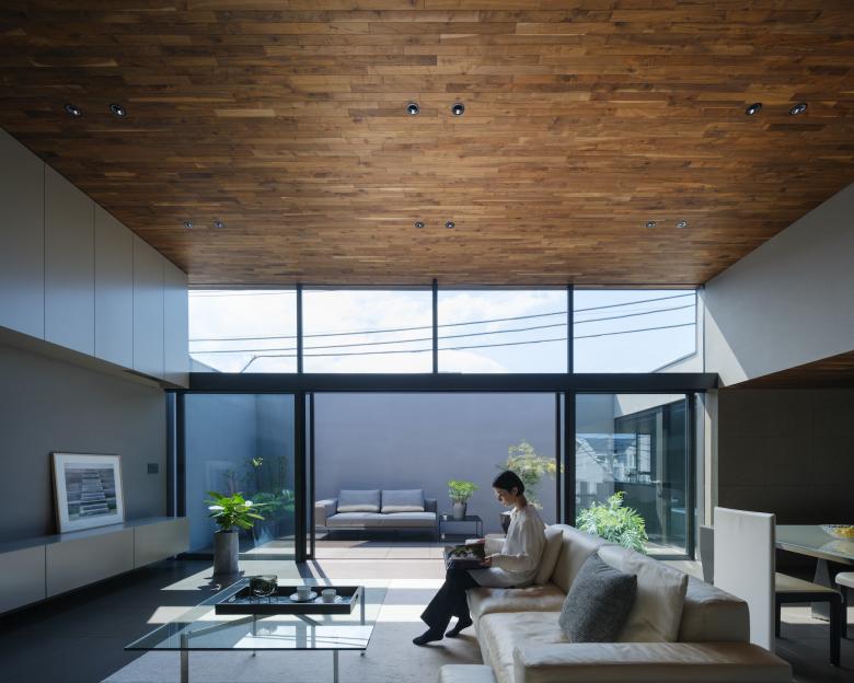 イタリア製のモダン家具や照明器具と天井のウォルナット材やトープカラーの内装がエレガントな空気感を創出。プライバシーを確保した中庭からの自然光が空間全体を優しく包み込み、ゆったりとした広がりと特有の静寂感が生まれている。