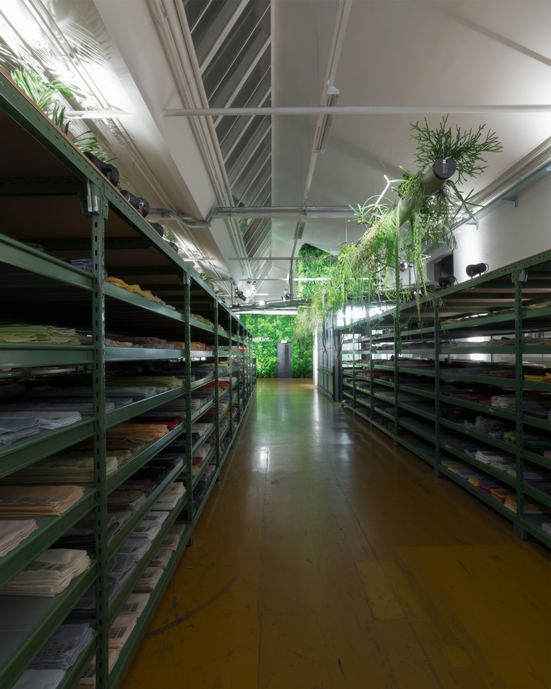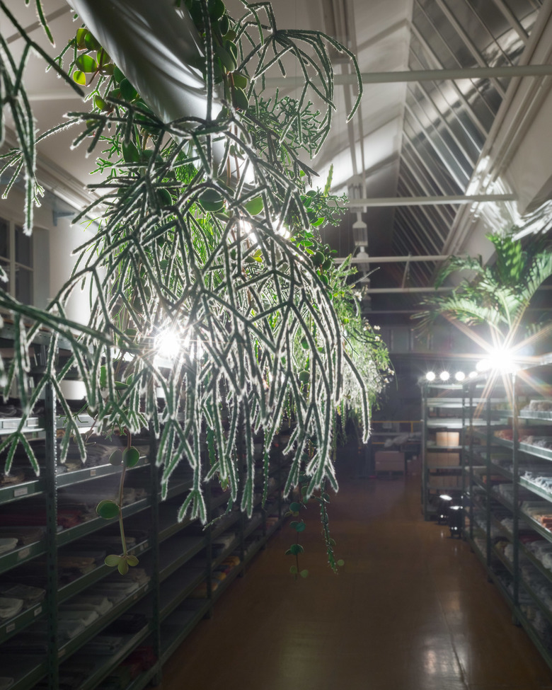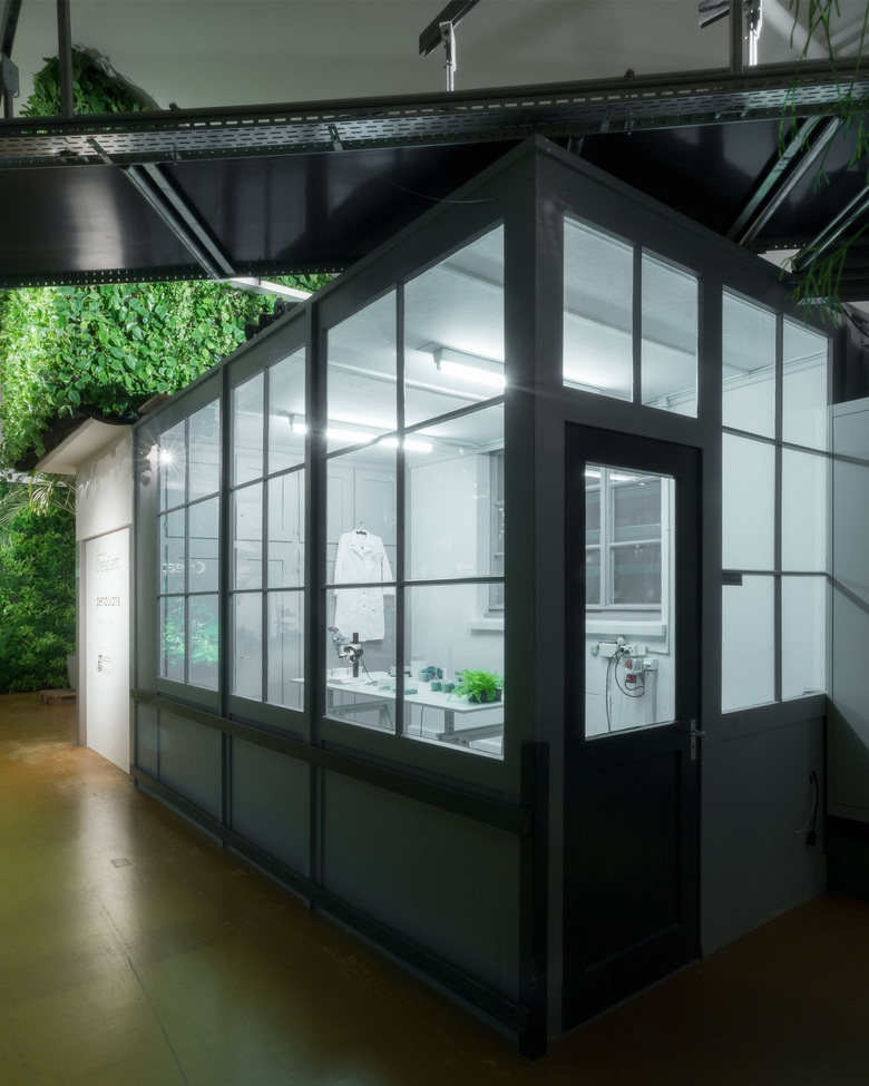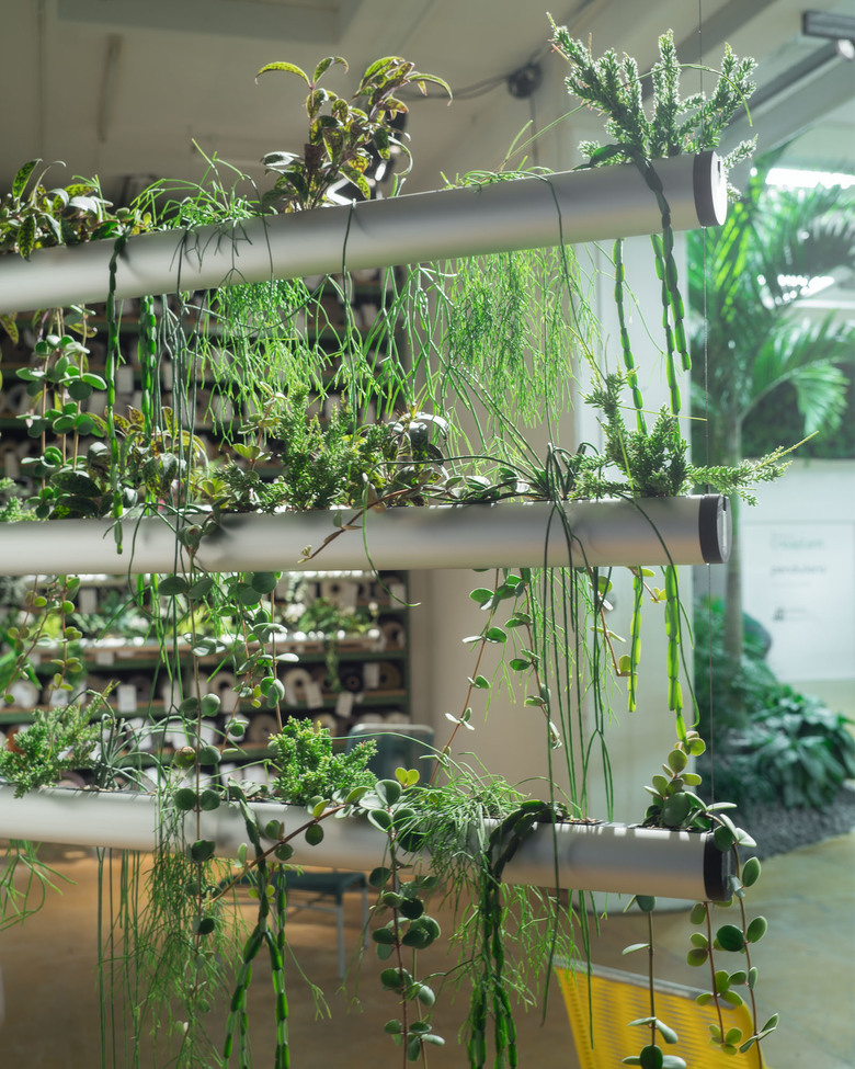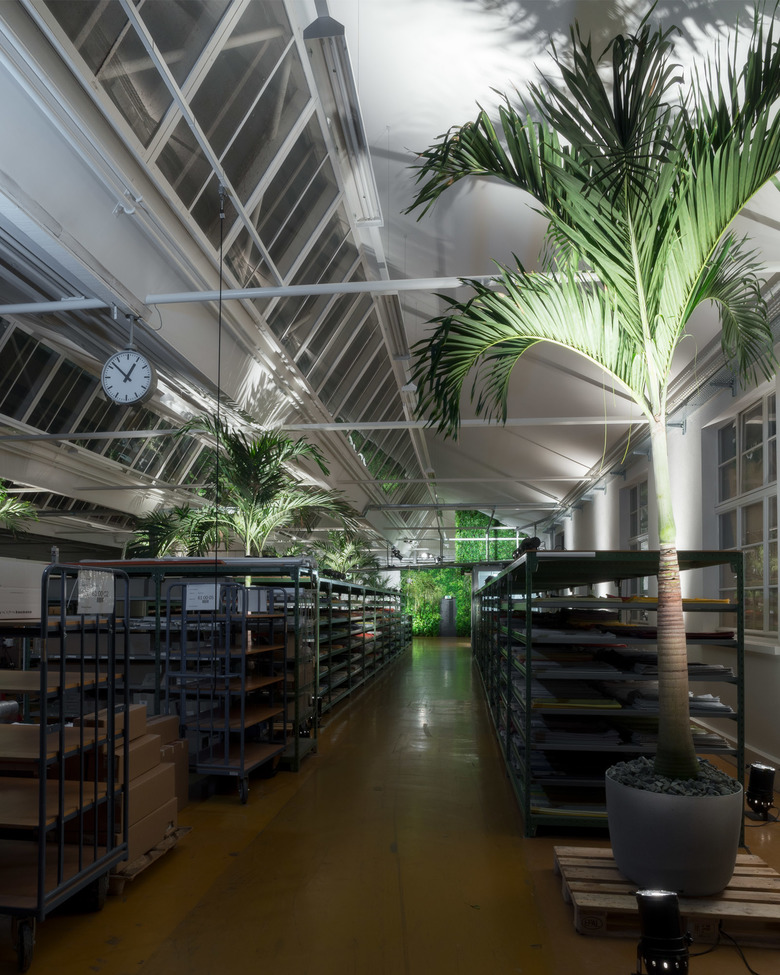 Mit den Sheddächern und Oberlichtern erinnert die Produktionshalle von Création Baumann an ein Gewächshaus. Die Inszenierung übernimmt dieses Bild und lässt darin die Akteure spielen. Beim Eintreten fallen die Palmen auf, die über die Regale hinausragen, im Hintergrund zieht eine vertikale, begrünte Wand den Blick auf sich. Auf Augenhöhe erstreckt sich der ‹Pendularis Floating Indoor Garden›, ein mit Pflanzen bestücktes Aluminiumprofil. Der Raum öffnet sich und überall lassen sich Details entdecken, die die vielfältige Arbeit von Creaplant zeigen: Die Kultivierung der Sukkulenten, die Bepflanzungssysteme oder ihre Anwendungsmöglichkeiten.