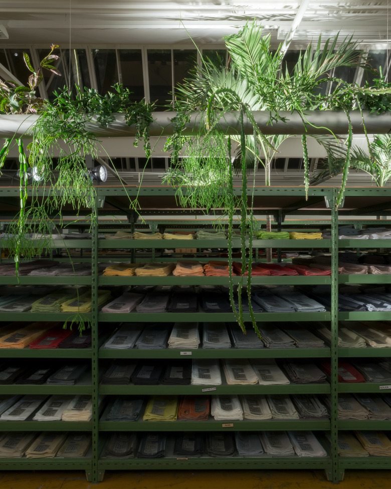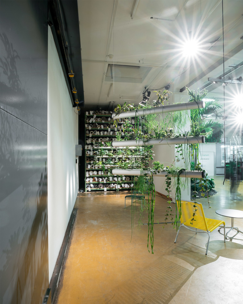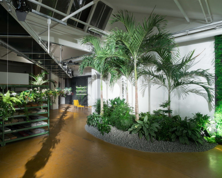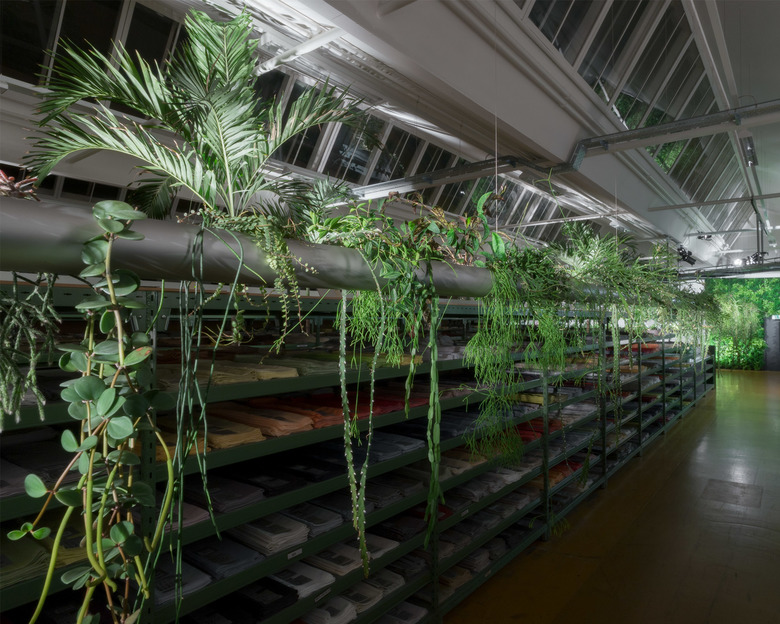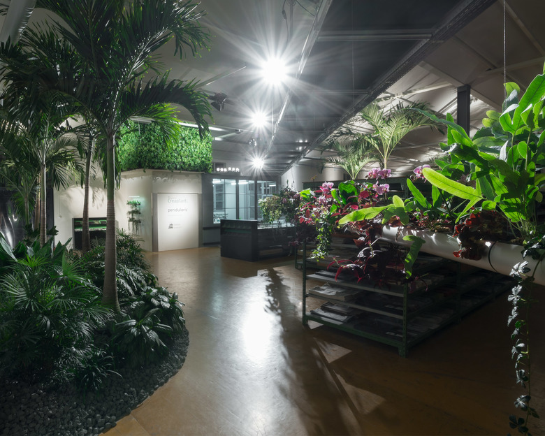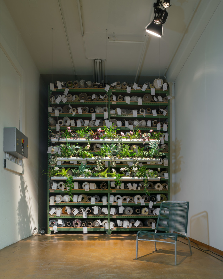 Mit den Sheddächern und Oberlichtern erinnert die Produktionshalle von Création Baumann an ein Gewächshaus. Die Inszenierung übernimmt dieses Bild und lässt darin die Akteure spielen. Beim Eintreten fallen die Palmen auf, die über die Regale hinausragen, im Hintergrund zieht eine vertikale, begrünte Wand den Blick auf sich. Auf Augenhöhe erstreckt sich der ‹Pendularis Floating Indoor Garden›, ein mit Pflanzen bestücktes Aluminiumprofil. Der Raum öffnet sich und überall lassen sich Details entdecken, die die vielfältige Arbeit von Creaplant zeigen: Die Kultivierung der Sukkulenten, die Bepflanzungssysteme oder ihre Anwendungsmöglichkeiten.
