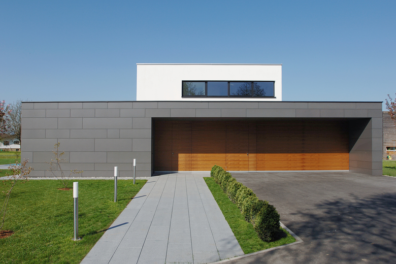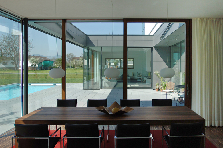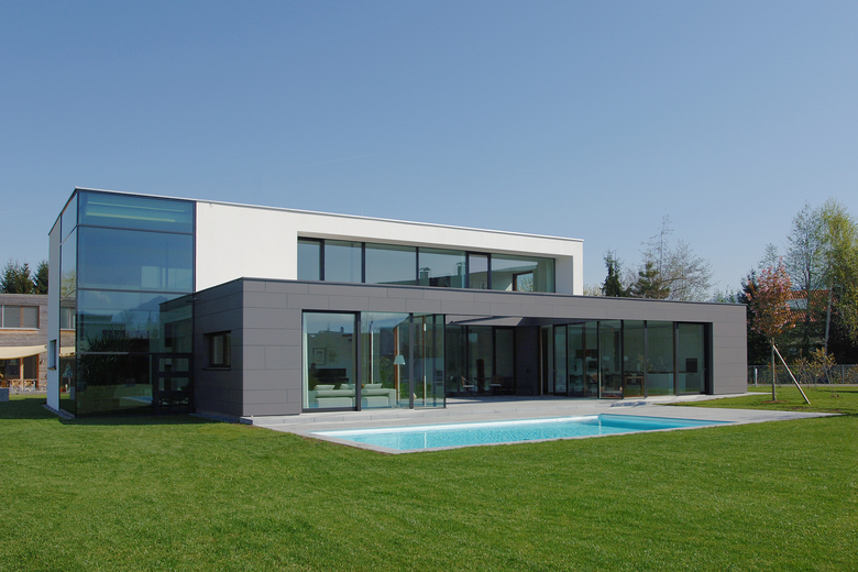 Die geometrische und architektonische Grundidee besteht in der Verschneidung zweier Kuben. Der eine eingeschossig und horizontal orientiert, der andere zweigeschossig und vertikal aufgestellt. Die Verschneidung wird durch die Materialwahl hervorgehoben. Der horizontale Kubus ist mit Eternit verkleidet und ruht, durch eine Schattenfuge getrennt, auf dem Boden. Der weiss verputzte vertikale Körper steht im Kontrast dazu. Durch Einschnitte in die Körper entsteht eine überdeckte Eingangssituation, eine Terrasse und ein Balkon. Großflächige Verglasungen des Wohnzimmers, der Küche und vor allem des Palmenhauses lösen die Kuben in ihrer strengen geometrischen Form weiter auf.