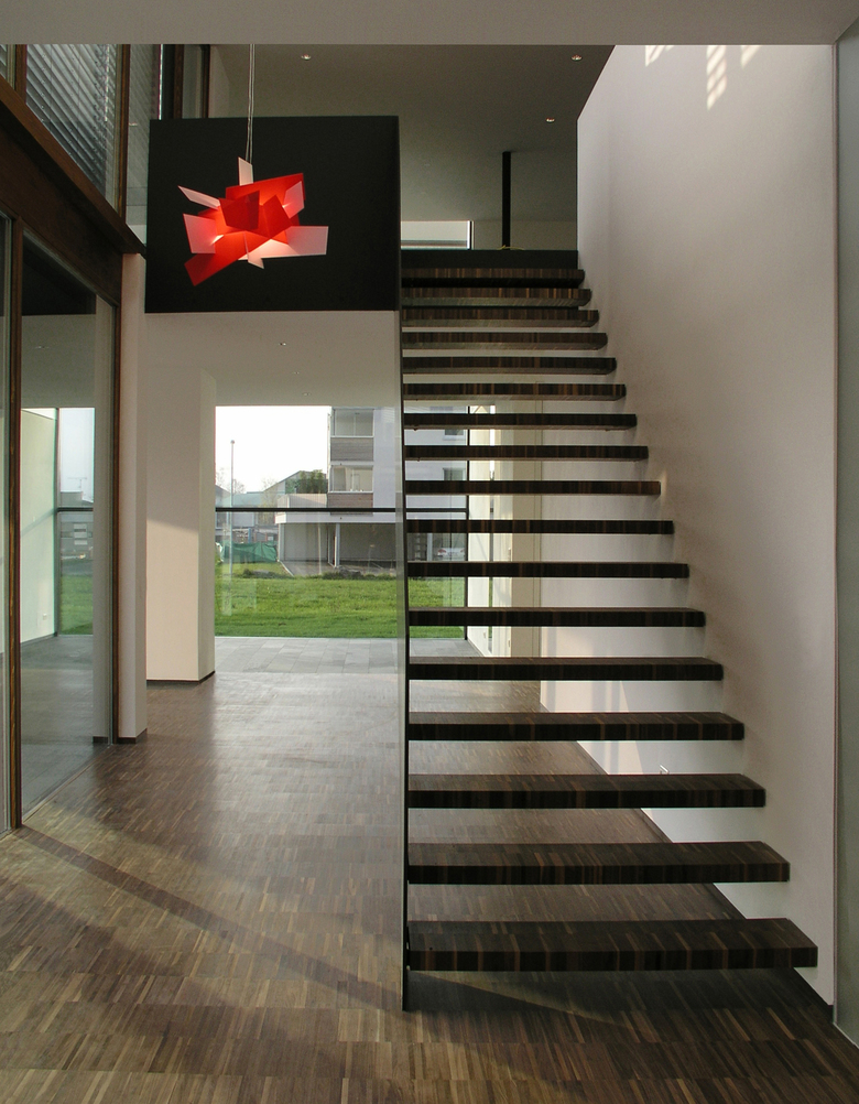 Die Eingangssituation zusammen mit dem Garagentor ist in der Fassade zurückversetzt. Sie hebt sich durch ihre Materialwahl, Holz, von der Eternitfassade ab. Betritt man das Haus, blickt man durch das gesamte Erdgeschoß hindurch bis in das Palmenhaus und durch dessen verglaste Fassade wieder in die Natur des Außenraumes hinaus. Der Fußboden des gesamten Hauses ist bis auf die Nassräume und das Palmenhaus mit Nussparkett ausgelegt.
