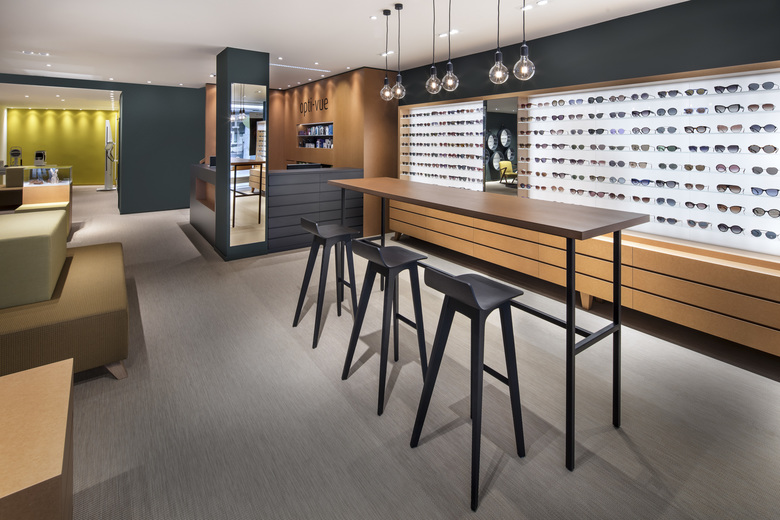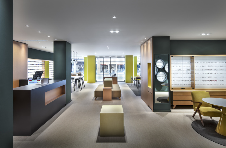 Im hinteren Bereich der Ladenfläche gelangt man zur Low-Vision-Abteilung, mit dem Servicebereich, der Refraktion, der Optomertie und der Hörakustik. Originelle, kubische Sitzinseln kombinieren sich aufgelockert mit Vitrinen zur weiteren Warenpräsentation. Direkt neben dem puren und dunkel gehaltenen Kassenbereich gelangt man über die neu platzierte Treppe zur ersten Etage, wo sich auf rund 170 m² die Werkstatt, der Kontaktlinsenbereich, eine weitere Refraktion, der Gläserbestellbereich sowie Büro- und Sozialräume befinden.