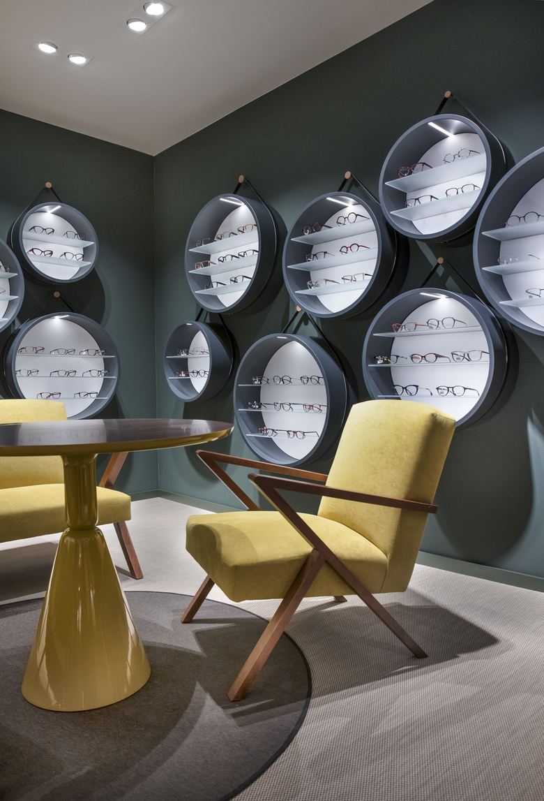 In einer gemütlichen Loungeecke, mit Sesseln in einem modernen 70ger-Jahre-Style, findet man die exklusiven Brillen, ebenfalls in runden Wand-Displays präsentiert. Ein Ladenbaukonzept – mit Wohnzimmeratmosphäre …