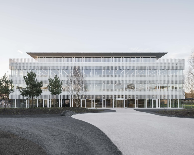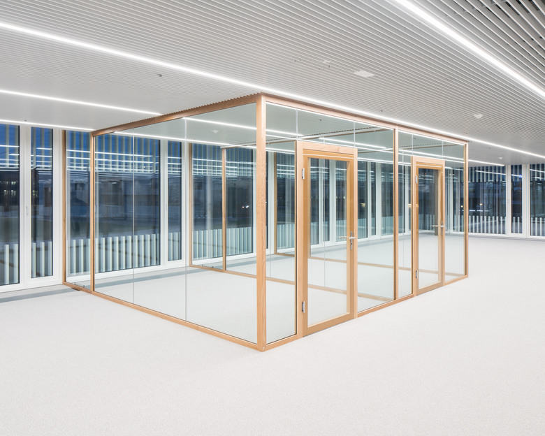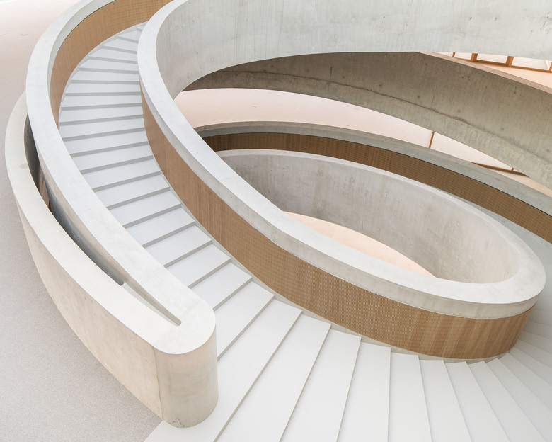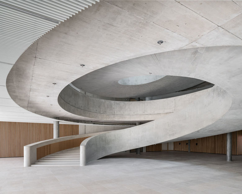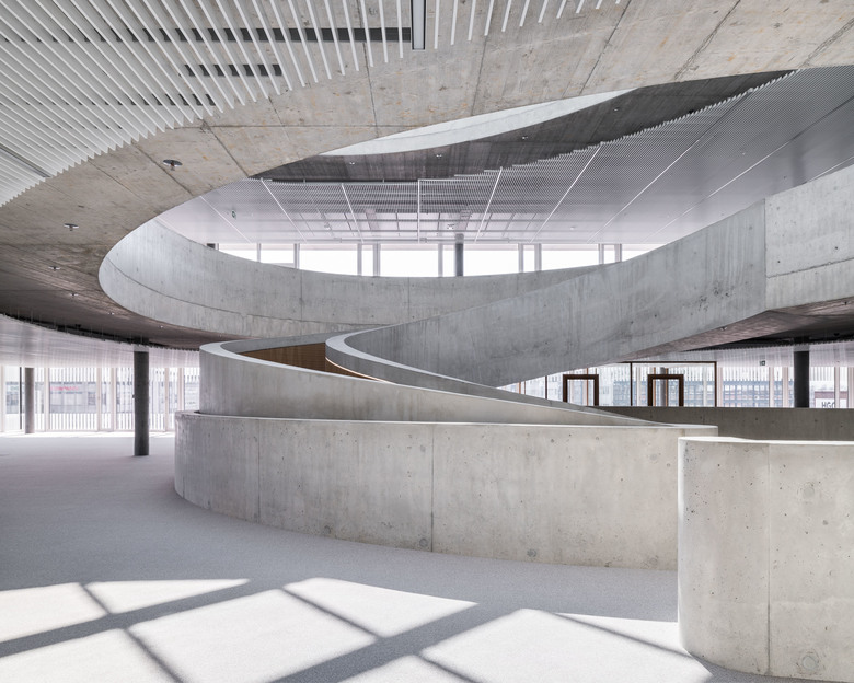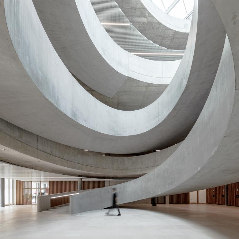 Auch das Innere des Gebäudes schafft Begegnungsräume. Ein natürlich belichtetes Atrium – geformt aus einer sich über alle Geschosse emporwindenden ellipsenförmigen Betonrampe – steht dem strengen Büroraster gegenüber. Das grosszügige Atrium und die skulpturale Rampe ermöglichen offene Begegnungs- und verspielte Kommunikationsräume. Der einzigartige Charakter des Bürogebäudes bricht die traditionelle Hierarchie der übereinanderliegenden Geschosse und fördert den informellen Austausch der Mitarbeiter und Mitarbeiterinnen.