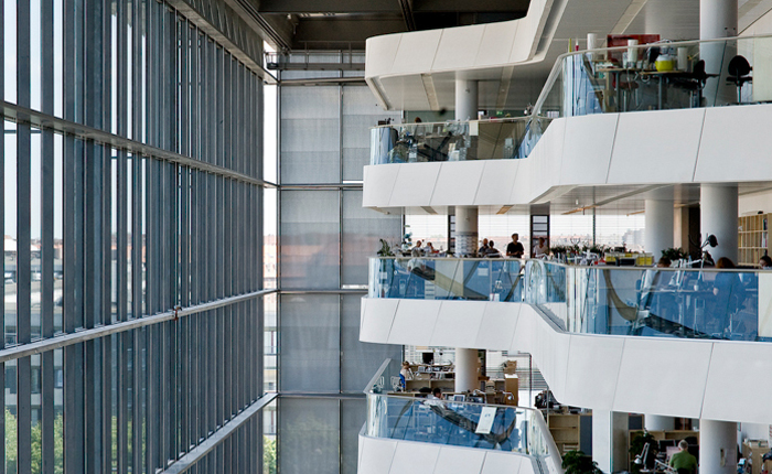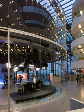 Media House for Danish Broadcasting Corporation The concept of dynamism can be seen in all facets of the building. The large, transparent facade opens the news building towards the urban space, allowing direct views into the enormous atrium embracing the whole building over several floors, creating a connection between the organic, curved balcony, the central news studio and the building’s internal street. The interior design ranges from open office landscapes to various individual rooms for project teams with smaller cellular offices and quiet rooms.
