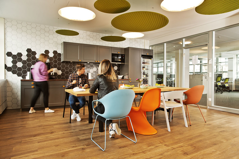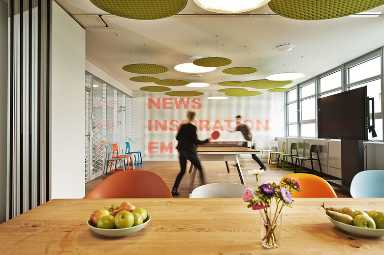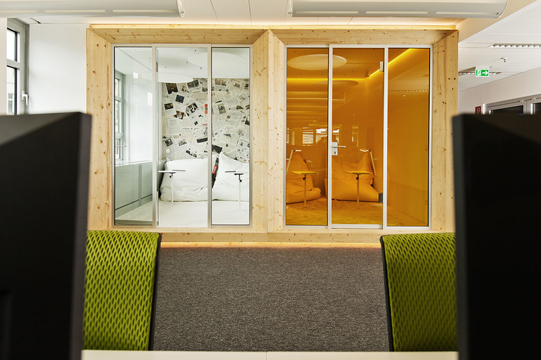 Produkte aus dem Rossoacoustic Pad System und Modul R Project-Leuchten von Nimbus machen den Cloudgedanken, der hinter digital produzierten Informationen steht, in der Fläche erlebbar. Die verschiedenen Konferenzräume und Rückzugsbereiche sind auf Basis unterschiedlicher Themen gestaltet und wurden mit viel Liebe zum Detail ausgestattet: So wurden neben einer Skihütte, einem Sportstudio und einem Baumhaus - beispielsweise ein Kino und Tischtennisraum räumlich inszeniert. Das Ergebnis ist eine moderne, zeitgemäße und gut nutzbare Bürofläche.