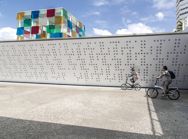 The project is completed by a cultural centre which also serves as a visual attraction. El Cubo, a branch of the Centre Pompidou, is without doubt the most characteristic part of the project, not only for its strategic position, but also for the boldness of its form. The centre itself occupies the majority of the 6,300m2 on the ground and lower ground floors at the corner of Muelle Uno and its exterior features two elements of considerable plasticity. Firstly, the roof of the Centre forms a new plaza at the same level as the city, using a fifth façade to evoke a sea of stone out of which emerges el Cubo, the building's insignia. Now an iconic symbol of the new wharf, this cube has glass sides twelve metres long. The metal framework is covered by dozens of glass sheets which overlap like fish scales filtering the light which enters the cultural centre and enriching the texture of the sides of the cube itself, which has recently been given a new touch of colour by French artist Daniel Buren.