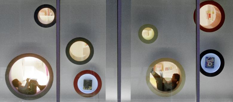 Holes of different sizes are designed on the bookshelves against the wall, serving as not only windows to pass internal and external information but also as reading spaces for children. The scenery of children sitting and reading not only decorates the elevation of the store but also gives the appearance of a delightful store to people on the outside.
