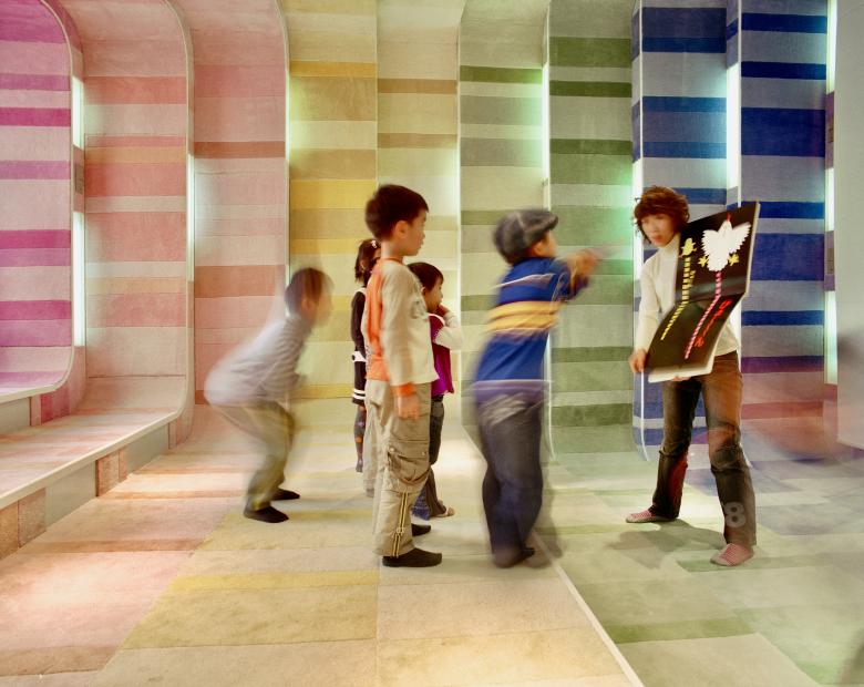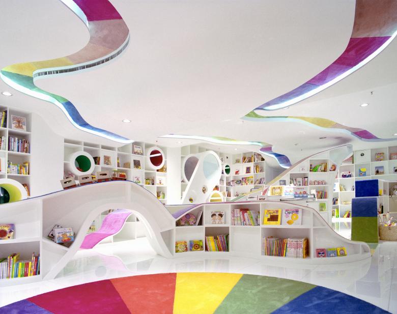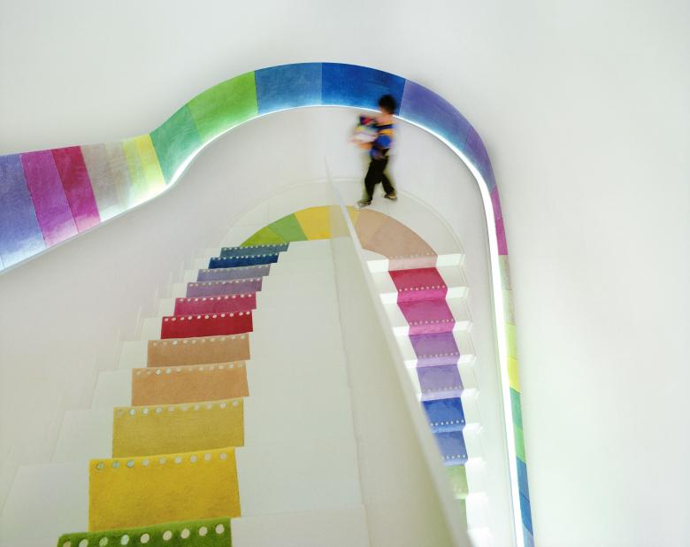The stairs leads the children to the bookstore on the second floor. The rainbow-like ribbon starts from the hall and goes up along the stairs till the bookstore. The 100-meter-long colorful ribbon, which serves various functions at various places, whirls and twists in the store; it finally ends in the room and goes back to the armrest of the staircase baluster on the first floor where it had started.