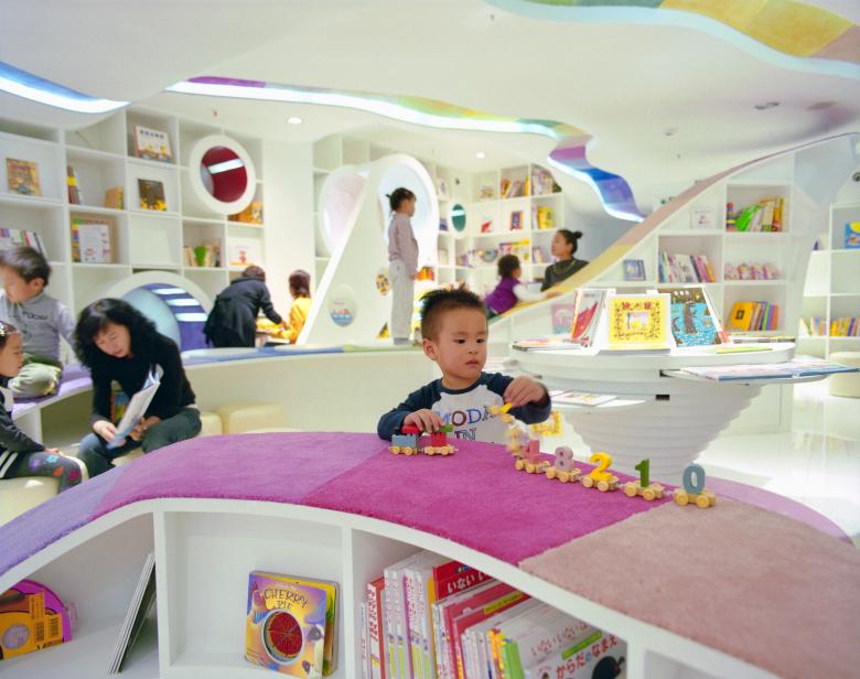 The front covers of children’s picture books have rich and bright colors. In comparison to those bookstores selling professional books, the collection of such picture books can produce a cheerful space. No orderly bookshelves can be found here, and children can sit in places that appeal to them and read the picture books at their own pleasure. The colorful ribbon starting from the stairs twists and whirls in the store, and it comes in contact with the bookshelves, tables, gate, checkout counter, and ceiling, and finally, the armrest of the stairs.