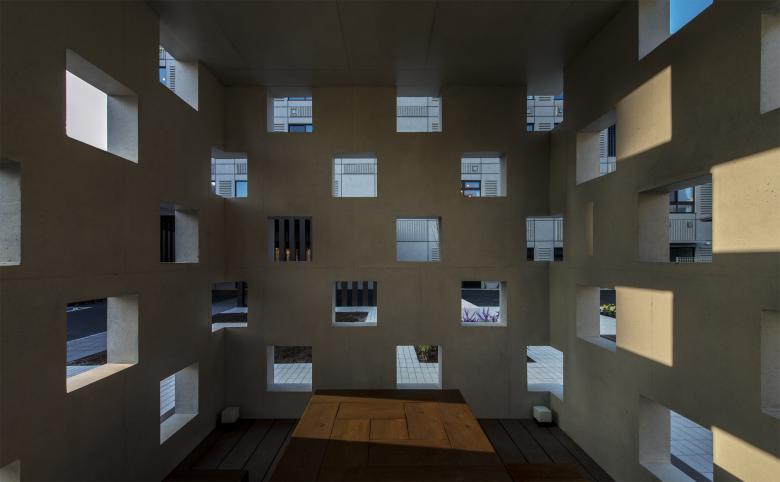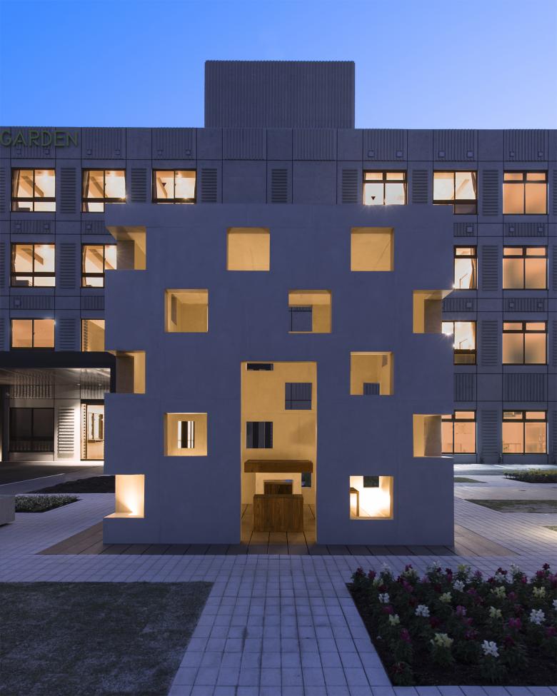 The cube-shaped pavilion features rhythmic openings that create a beautiful contrast of light and shadow, captivating residents and visitors alike. This space serves as both a relaxing area and a place that richly stimulates the senses.