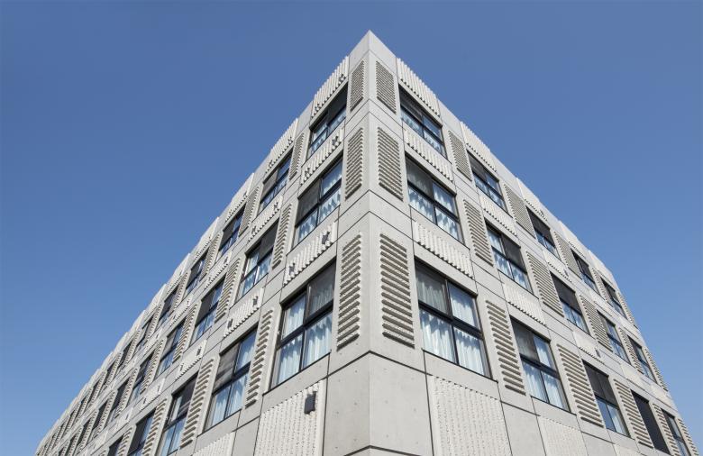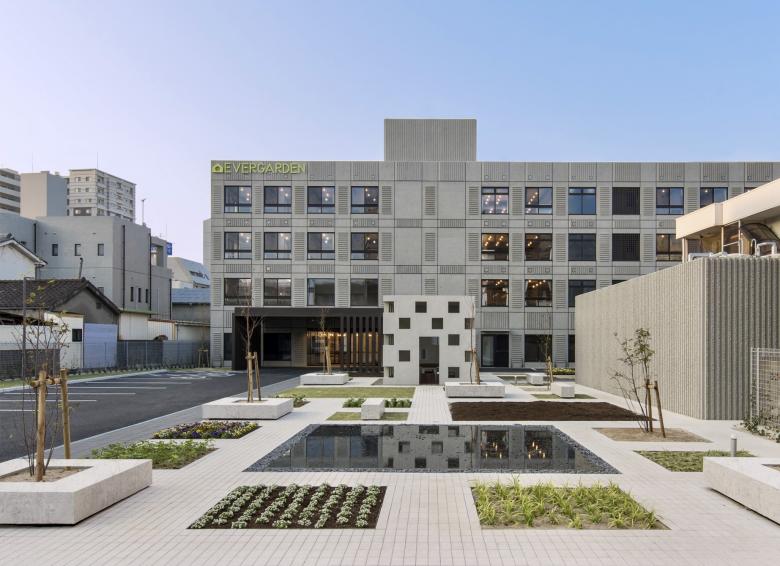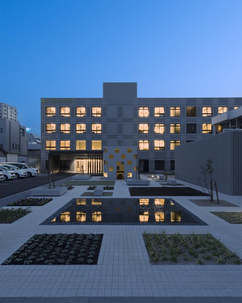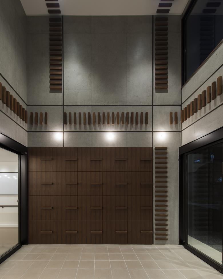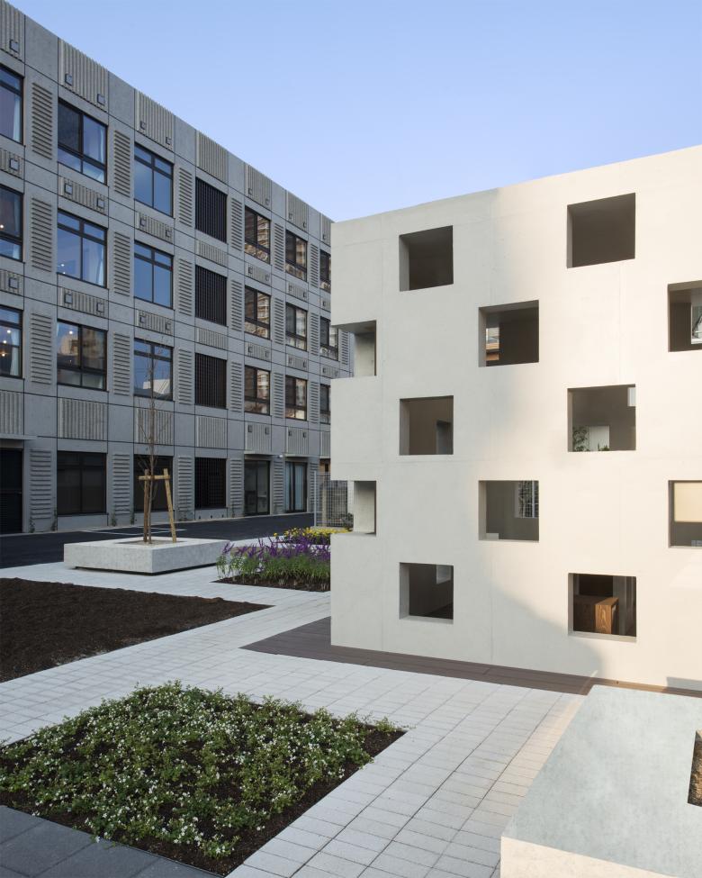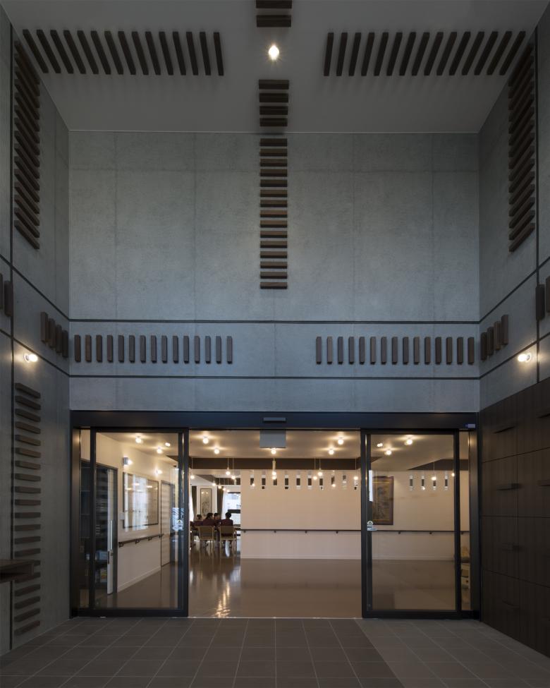 The main building and pavilion, simple concrete volumes in the form of a tube and a cube, have been transformed into a comforting “MONOLITH” through carefully considered textures and openings, softening the hardness of the concrete and creating a sense of peace for residents and visitors.