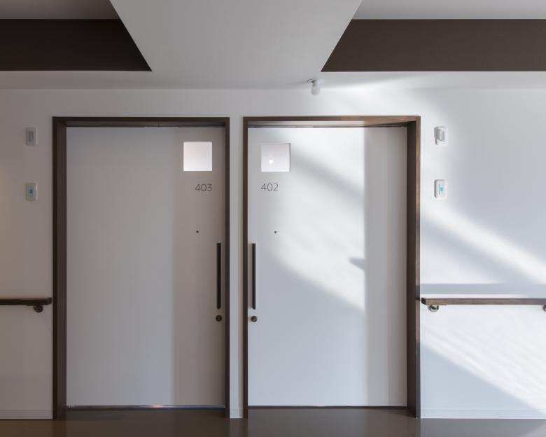 The interior is designed with a calm and welcoming atmosphere, using a palette of white and brown tones. In the entrance hall, the exterior’s stripe pattern is recreated in wood, enhancing the continuity of design. While vinyl materials are commonly used in assisted living facilities for ease of cleaning, wood is employed here for handrails and handles, allowing residents to experience the warmth of natural materials.