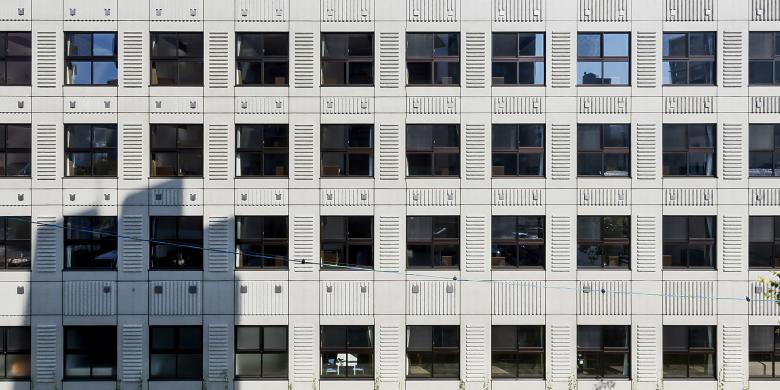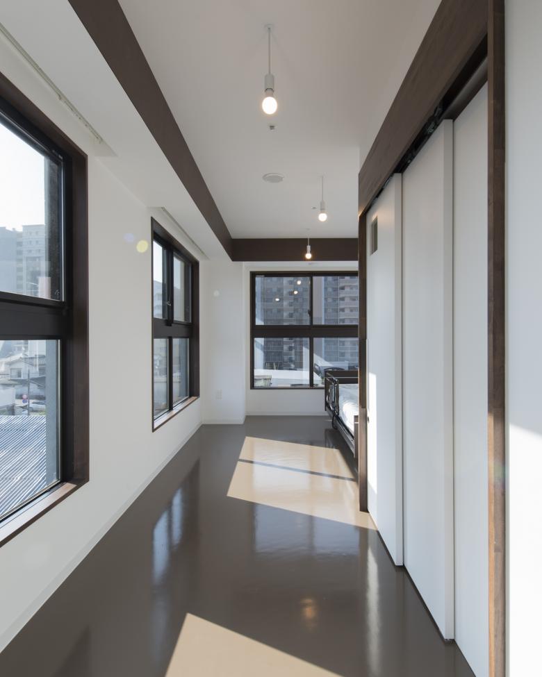The exterior is finished in exposed concrete, with its robust appearance providing peace of mind against earthquakes and other disasters. To soften the concrete’s cold impression, custom formwork was used to create a textured surface. The fine, stripe-like bumps etched into the facade generate consistent shadows, reducing the visibility of dirt compared to smooth concrete and helping to lower maintenance costs. Fly ash concrete was also used to minimize cracking.