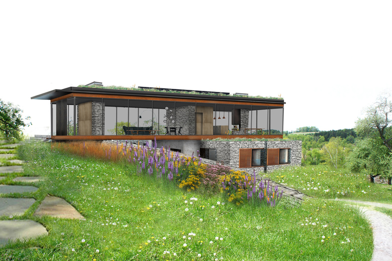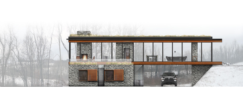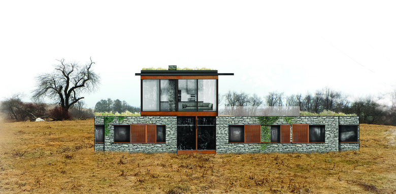 The home utilizes numerous green building techniques, from planted roofs and photovoltaic panels to a geothermal based HVAC system which incorporates radiant floor heating and cooling throughout. Additionally the design of the second floor roof creates a deep southern overhang to provide for cooling shade in the summer and solar heat and light in the winter months. All the materials and finishes are consistent with the coloration of the local landscape and the exterior material selections of rough field stone, naturally aging cor-ten steel and planted roofs are carefully selected to help ground the house within the pastoral landscape.