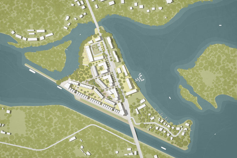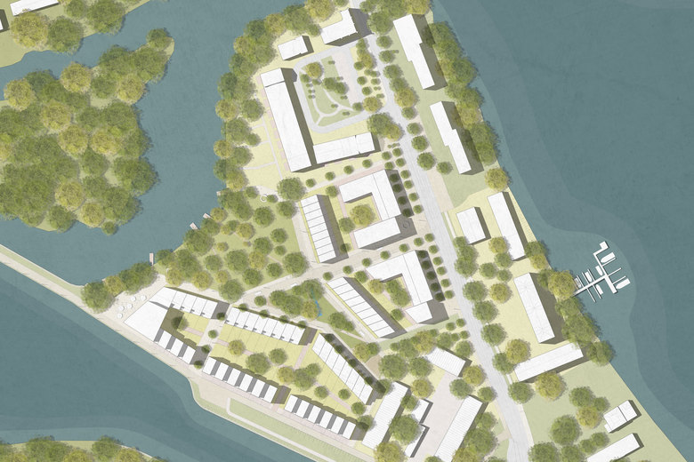 Der harte landschaftliche Schnitt des Sacrow-Paretzer-Kanals mit dem sich anschließenden linearen Schiffsanlegerdamm wird durch eine klare Bebauungskante als Gegenüber zur Waldkante der gegenüberliegenden Kanalseite herausgearbeitet. Zusammen bilden die linearen Elemente ein markantes Landschaftselement innerhalb der Havellandschaft. Die Bebauungskante wird durch Blöcke bestehend aus Kanalvillenketten rhythmisiert. Durch die Lage am Kanal erhalten sie eine einzigartige Adresse in Potsdam. Der Versorgungsweg der Bundeswasserstraße wird zur Promenade, die sich an der westlichen Spitze zu einem kleinen platzartigen Raum zwischen Bucht und Kanal und als Auftakt des pierartigen Damms aufweitet und durch eine kleine Ausflugslokalität zum Zielpunkt wird.