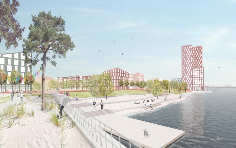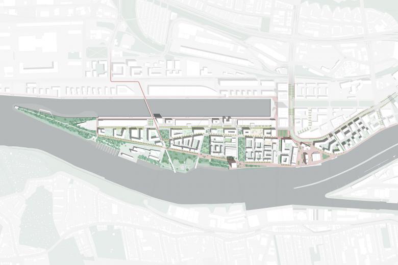 Strukturell ist die Überseeinsel geprägt durch die lineare „Kontur“ des Europahafens mit seinen langen, monumentalen Schuppengebäuden sowie durch ein vielfältiges Flussufer entlang der Weser, das durch die großen Einheiten ehemaliger industrieller Gebäude rhythmisiert ist. Als infrastrukturelles Rückgrat liegt zwischen diesen beiden Flanken ein Gleisstrang mit einem charakteristischen Bogen. Die städtebauliche Struktur greift diese Spuren der ehemaligen industriellen Nutzung für die Erschließung und Quartiersbildung auf und verbindet beide Ufer durch grüne Fugen, die die vorgefundene Wildnis „fortschreiben“. Fluss und flache Topografie sind Voraussetzungen für die Verschiebung der Mobilität zum Fuß-, Radverkehr sowie innovativem Schiffsverkehr.