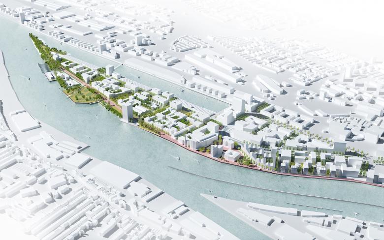 In Bremen entsteht seit dem Abzug von Kellogg zwischen Weser und Europahafen, auf einer Fläche von etwa 41 Hektar die Überseeinsel. Sie verbindet Fluss und Hafenbecken, Wohnen und Arbeiten ebenso wie Geschichte und Zukunft. Lagegunst und historische Substanz sind Ausgangspunkt für einen erkennbaren, wasserorientierten Stadtteil mit freiräumlichen Angeboten und Zielorten für die gesamte Stadt. Sozial und funktional gemischte Quartiere mit direktem Bezug zur Weser ergänzen den wertvollen Bestand und säumen die bis zur Molenspitze verlängerte innerstädtische Uferpromenade.