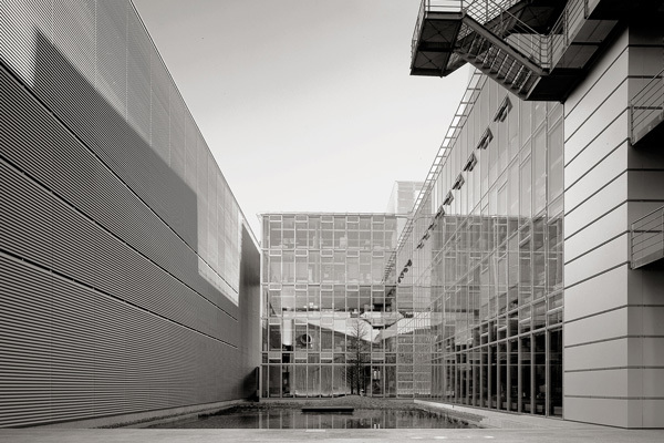 Entsprechend dem orthogonalen Raster des Masterplans für den Hauptbereich des Zentrums Zürich Nord entstanden für Baukosten von 120 Millionen Franken zwei Gebäude: ein Dienstleistungsgebäude für 1100 Mitarbeiter mit Konferenzzentrum und anschliessendem Parkhaus sowie ein westlich anschliessendes Produktionsgebäude mit 120 Werkstatt- und weiteren 60 Büroarbeitsplätzen. Schnelle Realisierbarkeit, minimiertes Kostenbudget und flexible Nutzbarkeit lauteten hier wie anderenorts die Vorgaben, die überdies mit architektonischer Qualität vereinbar sein sollten. Ein Stahlbetonskelett mit von der Fassade zurückgesetzten Stützen bot beim fünfgeschossigen Bürogebäude die Möglichkeit elementierten Bauens, durch welche sich die Bauzeit reduzieren liess; das Volumen ist nach dem Prinzip einer Kammstruktur organisiert, deren geschlossene, verglaste Front sich dem Park zuwendet, während die mit einem wolkenbügelähnlichen Gang im vierten Obergeschoss verbundenen, durch Höfe getrennten und mit dem Gerüst der Fluchttreppen versehenen Trakte auf der dem Produktionsgebäude zugewandten Westseite expressiv-industriell artikuliert sind. Die verglaste gebäudehohe Eingangshalle, von der aus die Konferenzbereiche direkt zugänglich sind, orientiert sich ebenfalls zum Park.