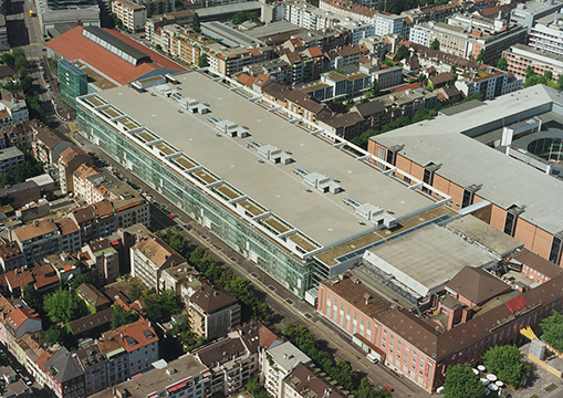 Der innerstädtische Grossbau besteht aus zwei aufeinander gestapelten Ausstellungshallen und einer unterirdischen Anlieferungszone.
