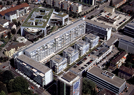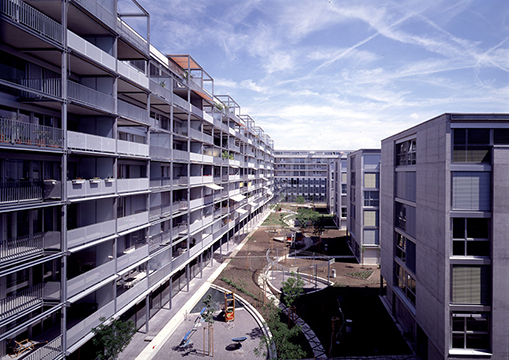 Industriebrachenumnutzung. Einseitig offene, 8- bis 9-geschossige Randbebauung mit vier freistehenden 6-geschossigen Innenhofgebäuden (vor allem Wohnnutzung).