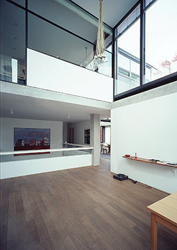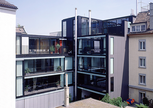 Die insgesamt fünf Wohnungen sind äusserst grosszügig bemessen; die drei grössten, mehrere Geschosse übergreifenden besitzen Dimensionen, welche ausserhalb der Innenstadt nur jeweils in einem Villenbau untergebracht werden könnten. Zweifelsohne am eindrucksvollsten ist die oberste Wohnung, welche von der Bauherrschaft bewohnt wird. Um eine zentrale Halle sind acht Raumbereiche so konfiguriert, dass sich verschiedene Durchblicke zwischen den Ebenen ergeben. Wirkt der auf dem System eines in neun Teilflächen aufgeteilten Quadrats entwickelte Grundriss auch zunächst schematisch, so erstaunt in der Realität eine komplexe Raumstruktur, bei welcher die tragenden Elemente auf das Notwendigste reduziert sind. Entstanden ist ein fliessendes Kontinuum, bei welchem oben und unten, rechts und links, hinten und vorne ineinander greifen. Die Treppen wurden auf ein Minimum reduziert, die Nasszellen sind wie in einer Loftwohnung zu eigenständigen Körpern geworden, welche die Tiefenausdehnung des Raums nicht mehr behindern, Terrassen verzahnen aussen und innen. Vier von ihnen umgeben, von den Lufträumen des darunter liegenden Geschosses getrennt, das wie ein Belvedere das Haus bekrönende Turmzimmer. Eine puristische, auf Sichtbeton, hellen Putz, Glas und das Holz des Parketts reduzierte Materialästhetik unterstützt dieses Konzept.