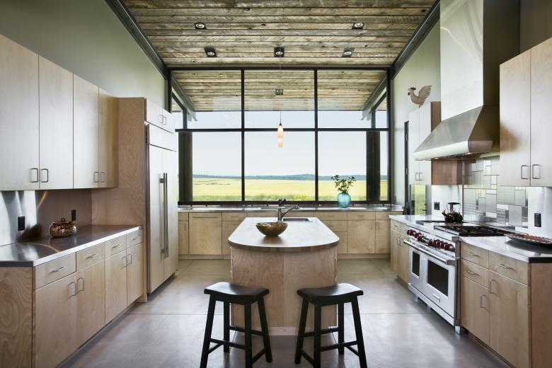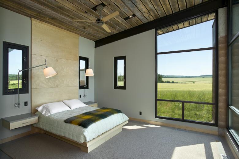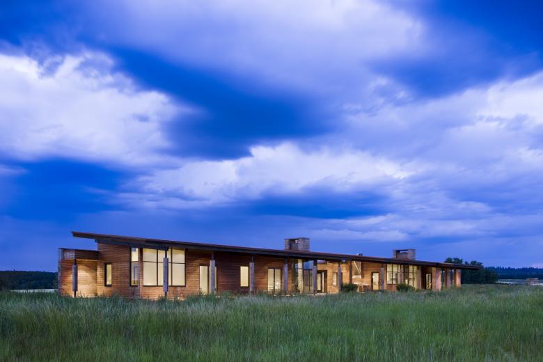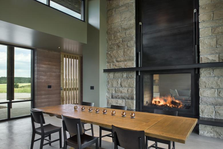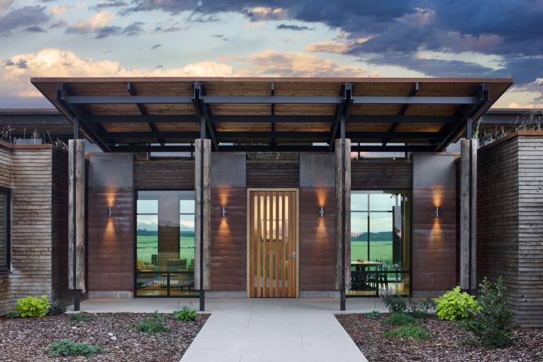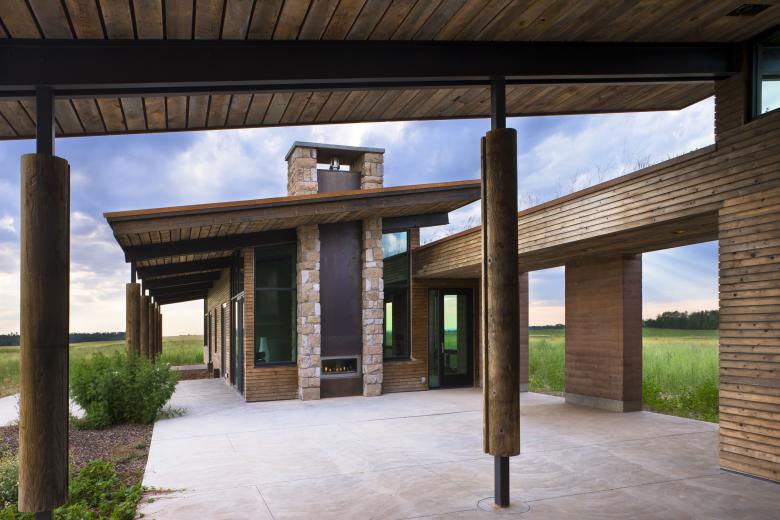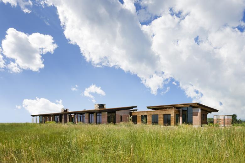 Taking cues from its flat open surrounds, the EarthWall 2 residence is as much a nod to its plane-like site as a product of it. An unabashed “ground-scraper,” the home’s sod-covered roofline enforces the horizontality of the site while deemphasizing the 6,000-square-foot volume. Composed of Ward + Blake Architect’s patented EarthWall post-tensioned steel rammed earth wall construction, the earthen walls literally rise from the soil that was used in their construction.