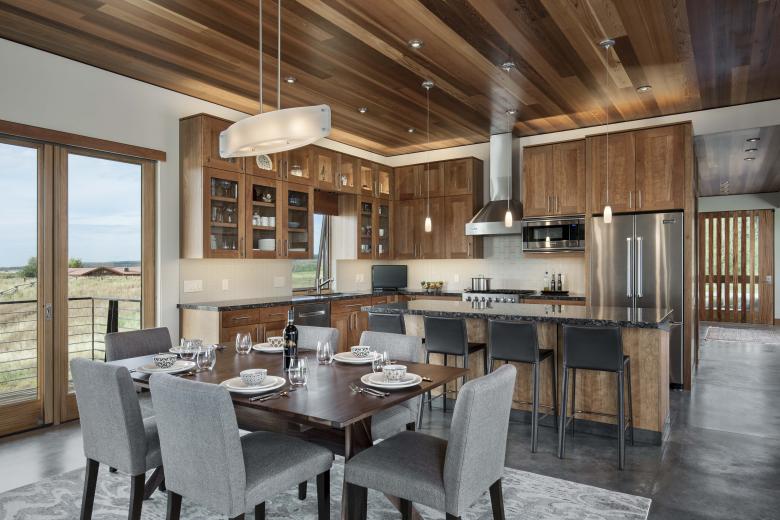 Large overhangs provide protection against the elements for exterior spaces while still permitting sunlight to flood the interior. A small sod roof helps connect the Guest Wing and Garage to the main volume of the house, forming an “L” shape plan that protects the exterior courtyard from prevailing winds.