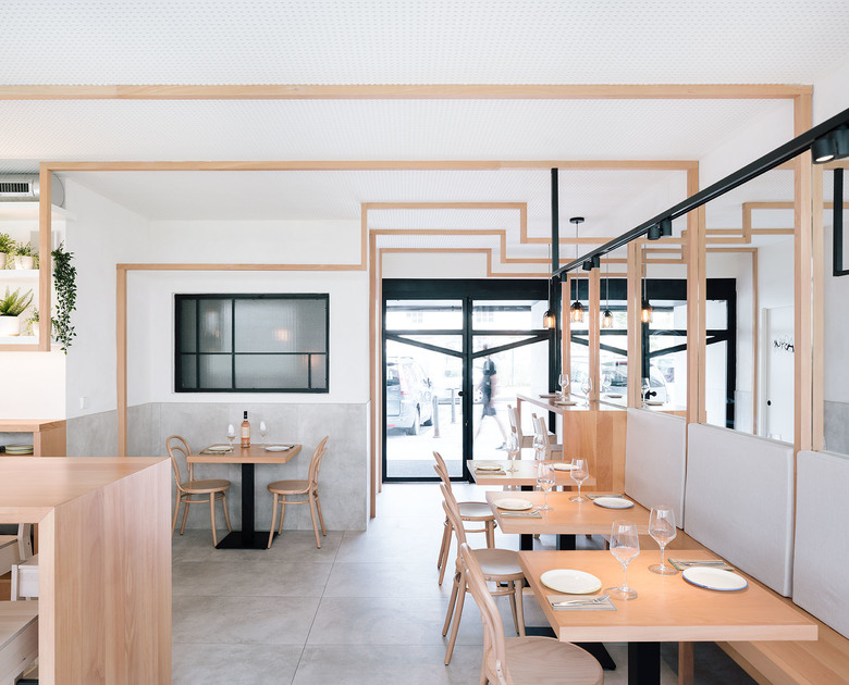 El espacio de planta rectangular se organiza con una trama de líneas paralelas en su sentido longitudinal, equidistantes entre sí. Dichas “líneas” se materializan mediante unos listones de madera que recorren de forma continua las paredes y techo del local, dotando al mismo de una estructura que nos permitirá organizar los distintos elementos que conformarán el restaurante.