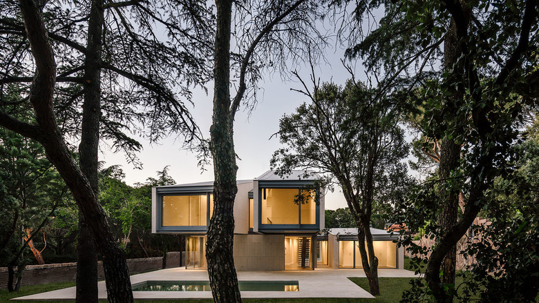 Situada en lo alto del terreno, se asoma hacia el bosque que nace al sur, enmarcando las vistas que proporcionan pinos, encinas y cedros.