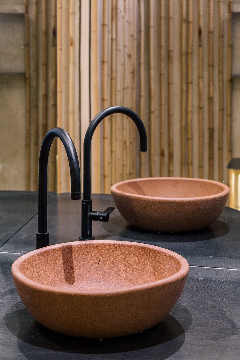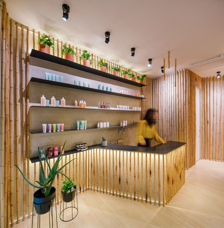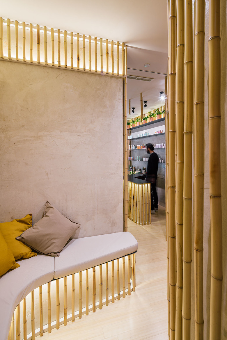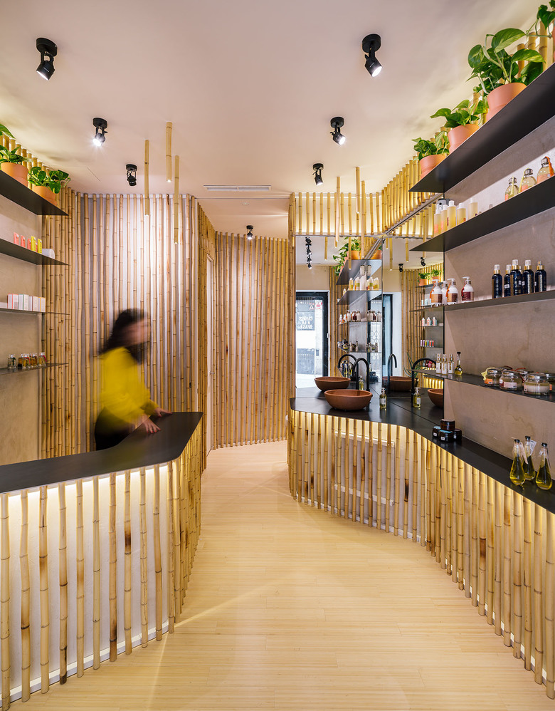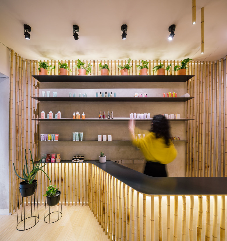 En la entrada, la marquesina es rodeada por una piel de varas de bambú de manera horizontal, haciéndonos entrever cómo va a ser el interior del local desde la perspectiva de la calle. Una vez entras al local, nos encontramos con la zona de exposición y tienda cubierta en su perímetro, por la piel de varas de bambú. Estas varas se amoldan a la morfología del mobiliario que el programa exige, cortándose mediante baldas voladas metálicas de hierro barnizadas. Las baldas voladas responden a su uso pegándose a la pared para almacenaje y exposición; ensanchándose para incluir una zona de lavado mediante un lavabo circular de terracota; o despegándose de la pared para generar al mostrador de la tienda. Las paredes se quedan enyesadas, haciéndose más marcadas en las zonas de mostrador, lavabo y zonas altas, donde se encuentran los leds, bañando de luz, tanto las paredes como las varas de bambú. Además, en la última balda, se colocan plantas naturales con maceteros de terracota.