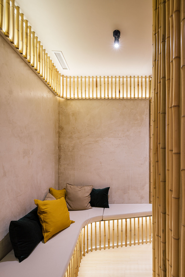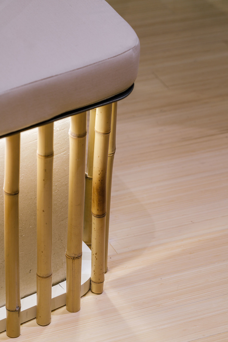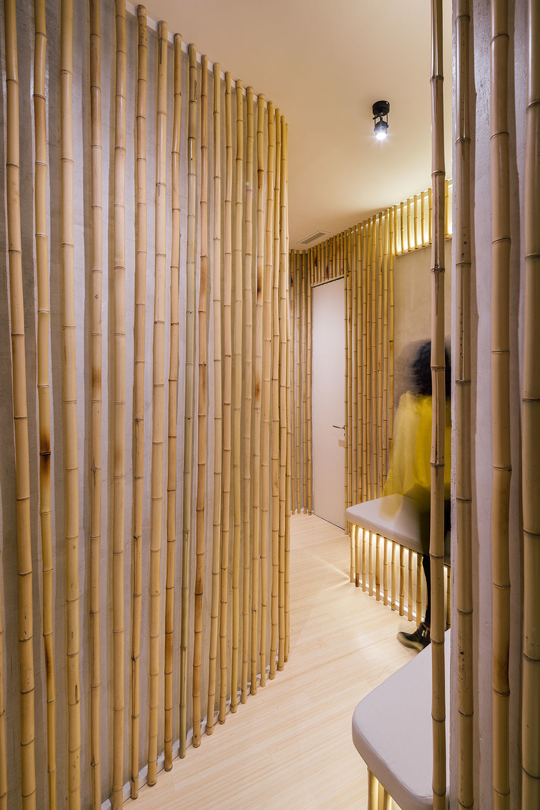 El proceso creativo de diseño nos lleva, debido a la naturaleza del programa, a pensar en un imaginario con materiales naturales y atmósferas cálidas y relajadas. Por ello, usaremos tarimas de madera de bambú para suelos, y varas de bambú a modo de segunda piel en paredes enyesadas dejándolas en un tono natural.