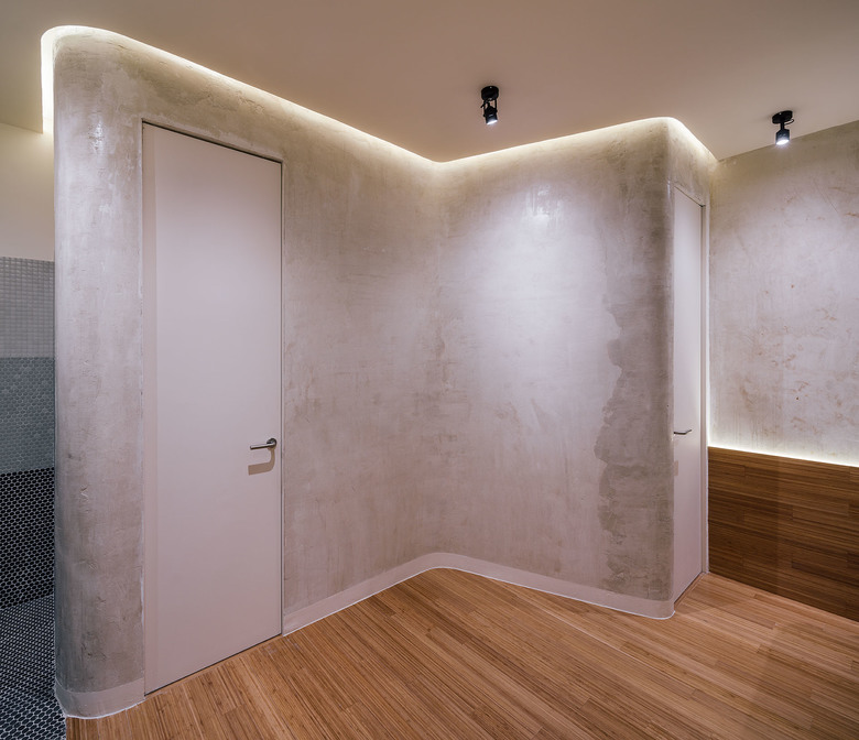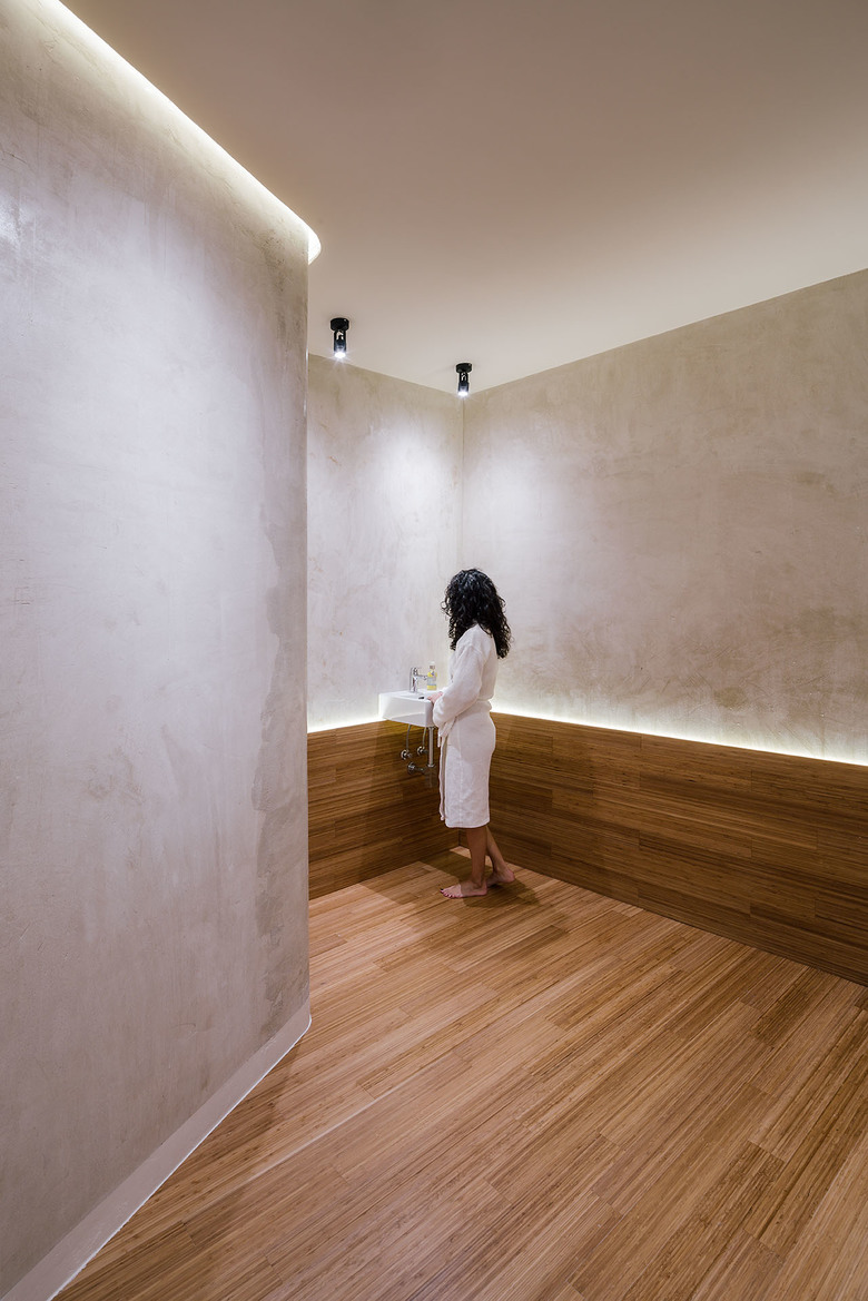 El área de masajes está diseñada de manera versátil para que se pueda hacer un masaje individual, un masaje por parejas, o dos individuales mediante un elemento divisor temporal en el medio. La materialidad de esta sala está realizada mediante tarima de bambú oscuro, y un zócalo del mismo material hasta una altura de 80cm. La luz, toda regulada al gusto del cliente, baña paredes y zócalo mediante leds, y se configura a su gusto mediante proyectores superficiales giratorios.