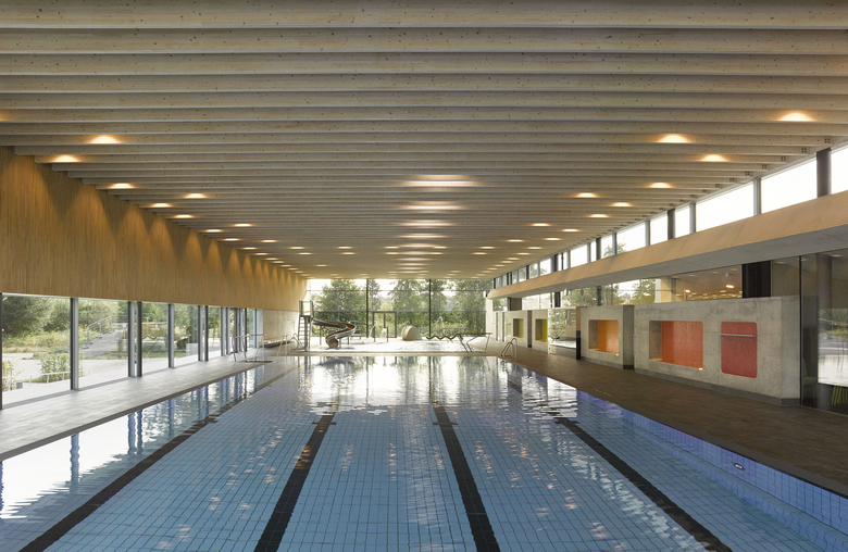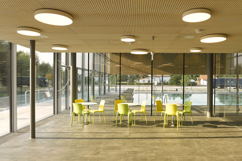 The clear organisation of the floor plan of the bathing hall and changing area allowed a compact and economical construction method with a favourable surface area to volume ratio. This has allowed a reduction in not only construction costs but also running costs to be achieved. While the basement and first storey are executed in exposed concrete, it was possible for the supporting structure for the large-span bathing hall and the changing area to be constructed with a timber frame design. The suspended, acoustically efficient lamellar ceilings and wall panelling along with the perforated Aleppo pine ceiling in the changing wing are also executed in timber. Due to its numerous positive properties and natural appearance the material wood is exceptionally suited to lending atmosphere to spaces with reverberant surfaces such as bathing halls and optimising room acoustics. Moreover, the high degree of prefabrication of the timber elements provided for an economical method of construction and shorter construction times.