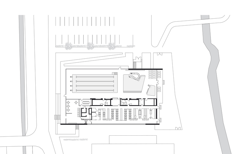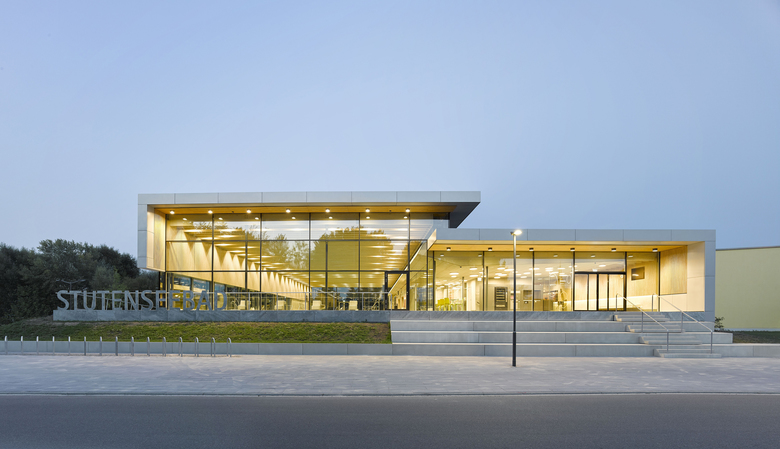 Plans for the new swimming pool focused on the construction of a high-quality building with a convincing design and a long service life. For this reason, the sustainability requirements of government-funded municipal building construction (NBBW subsidy programme) were applied to the development of the new building. The exterior of the compact building structure appears plain while the interior is infused with a vibrant, bright atmosphere that offers visitors maximum comfort. Architecturally, the Stutensee aquatic centre is divided into two spatial volumes which are clearly apparent from the outside. The spacious bathing hall comprises a swimmers’ pool, a learners’ pool with a slide and a toddlers’ area, all of which covers a total water surface of 368 m². A roofed terrace to the east further extends the facilities in the outdoor area. The adjoining entrance and changing area with shower and ancillary rooms to the south contrasts with the bathing hall due to its reduced ceiling height. The two structures interlock in terms of shape and materiality and merge together from the outside through a circumferential ribbon on the sheet steel façade.