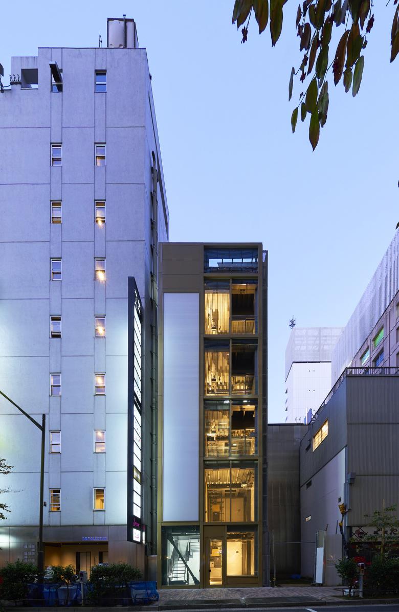 Tokyo’s famed Ginza commercial district commands the highest property values in Japan. Although the lot to be developed was only 6.27 metres wide and 5.46 metres deep, the relatively high value led to a detailed review of options to maximize rental income. A building three levels above ground is the limit for a staircase-only option, which in turn limits leasing and rent payments to three floors. More levels necessitate an elevator. The front-to-back alignment of staircase and lift and separate leasing of each floor, however, require a common corridor that leaves the ground floor with hardly any space for lease. A lift and staircase across the width of the façade would eliminate the common corridor requirement, although the street view from the inside would be blocked, and an escape balcony required on the third and higher floors could not be accommodated. The conclusion reached for this property was to master-lease a building with five floors above ground and a basement. The design incorporated the front-to-back alignment of staircase and elevator, and considered an upscale restaurant, jewelry store, or watch store as the target tenant.