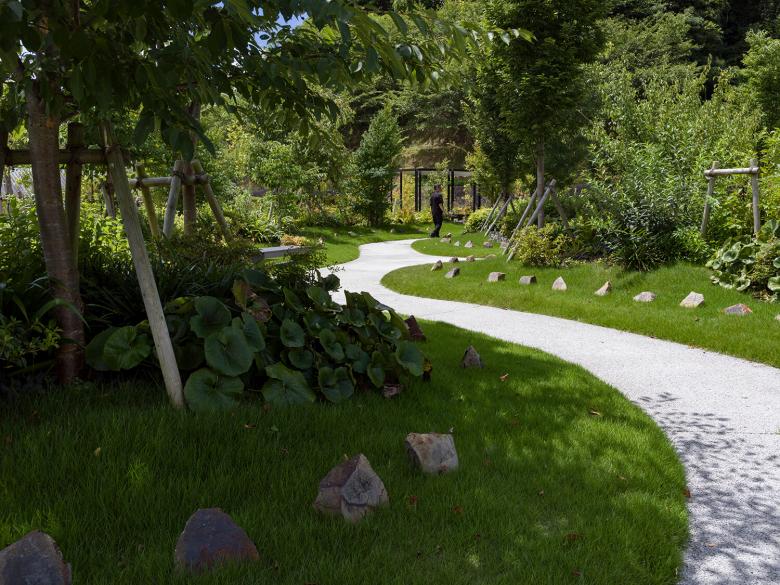 The paths have been designed to adjust sightlines and flow, creating a spatial composition that encourages the layering of memories and emotions according to the pace of walking and the length of stay. In addition, a pavilion has been built along the path as a space for conversation, meditation, reading, and rest. The pavilion is not merely a place to rest, but a device for memories that blends in with the landscape. The columns and beams made of channel steel guide rainwater from the roof to porous concrete at the base through open vertical gutters, connecting the architecture to the natural cycle.