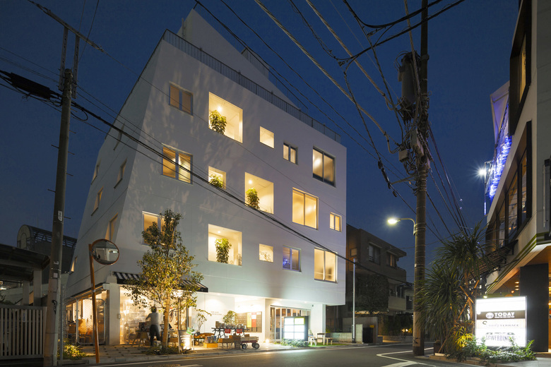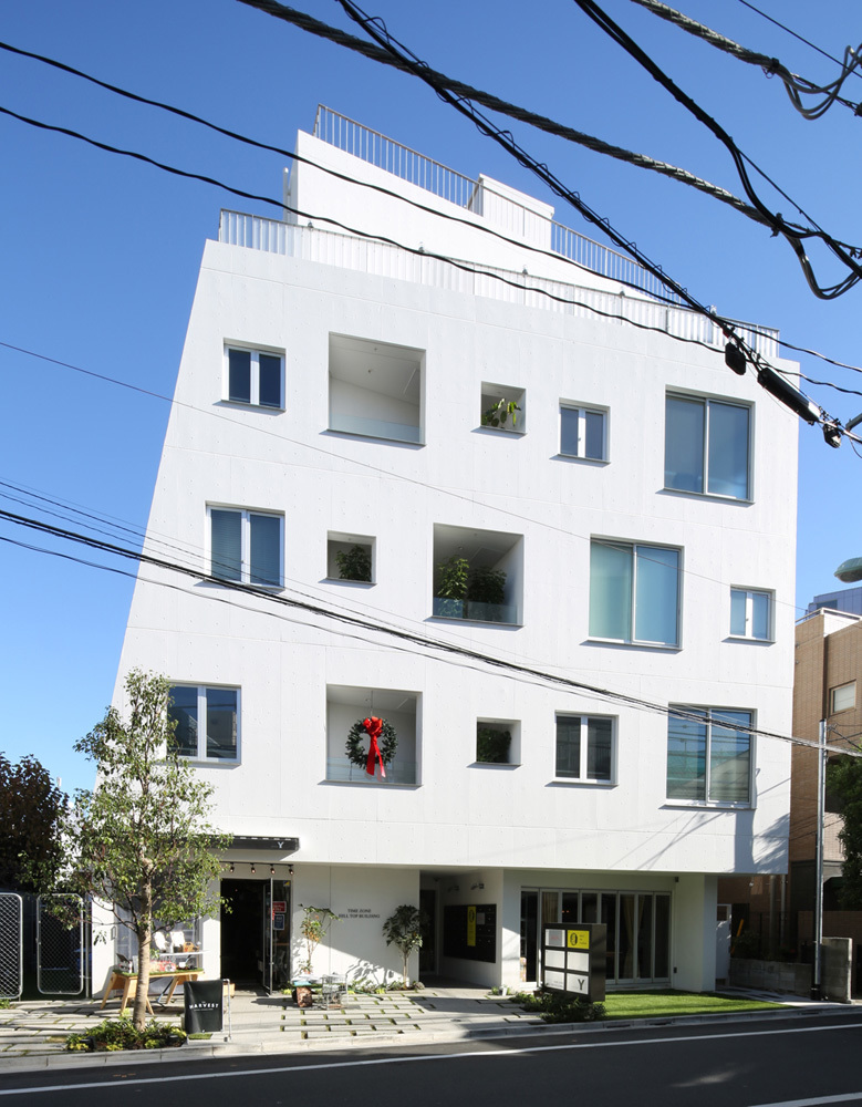Hill Top Building has an oblique facade in regard to the street, which is a method that was used also for the Terrace building. This set-back method of the two structures has produced a more welcoming entry to the site when approached from the Ebisu station. It has also created an open space for the tenants and the neighbors to hold events and activities.