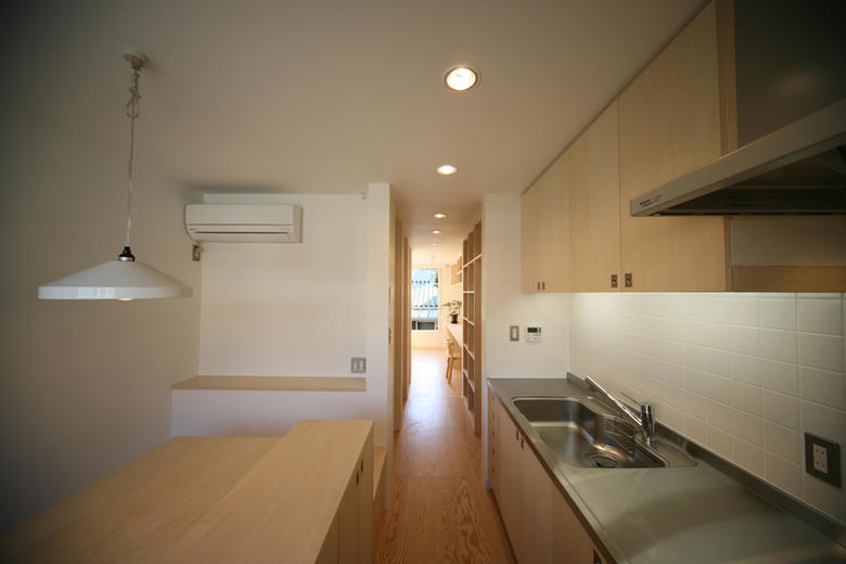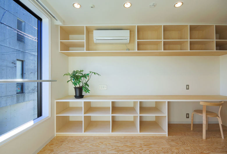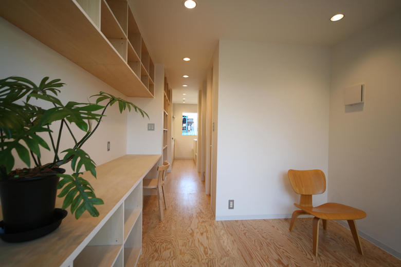 Contrary to a standard house, with its hierarchy between the rooms’ area from the wide living room to the small bathroom, this house has all its rooms with approximately the same area. The central staircase divides the space into living room and dining-kitchen, entrance-study and bathroom, children’s and parents rooms. As the space is limited, the living room becomes compact with everything within reach. Conversely, the bathroom is wide, emphasizing bath time as for enjoyment and leisure time. Moreover, in a way to enlarge those small individual spaces, wall furniture are extended out of the limit of the rooms as continuous element from an area to an other.