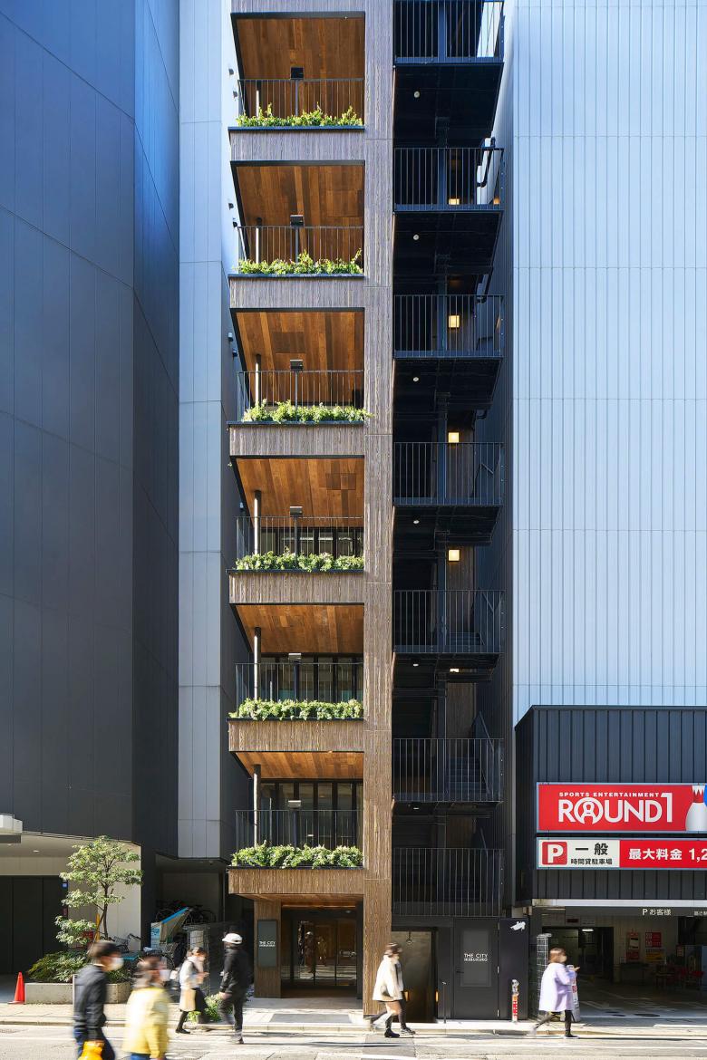A commercial tenant building with eight floors above ground and one below on a site between the large Round One building and the Round One mechanical car park building, facing the side road connecting Sunshine 60 Street and Sunshine Street leading from the Ikebukuro East Exit to Sunshine 60. The narrow site with a frontage of 6.8m and a depth of 16m would normally limit the appeal of the facade to the front only, but the Round One buildings on either side are set back 3m to make room for a 10-storey building, allowing part of the sides to be shown as facade as well as the front. The first floor section is designed to use this protruding shape to invite people in. The more heavily trafficked Sunshine 60 Street side juts out to guide people to the common elevator hall and the entrance to the first-floor shops. On the opposite side of Sunshine Street, an outdoor evacuation staircase has been installed to guide people to the basement tenants. We have been actively proposing the construction of food and beverage tenant buildings that we have designed, such as the Terrace Building in Ebisu and the Kanda Terrace, even before the Corona Disaster, but since the Corona Disaster, more and more tenants have requested outdoor spaces, such as terraces. This building also has a 2.5 m square terrace on the side façade on the Sunshine 60 Street side. As there is an opening restriction of 2 m around the outdoor evacuation staircase, if the facade surface next to the staircase is pushed out to the front, almost all of the facade surface becomes a wall, but by setting the terrace back, the opening restriction is circumvented and a large opening is created. To allow the terrace to be used as a continuous interior/exterior space, folding sashes were installed that can be opened all the way. When approaching from Sunshine 60 Street, this stacked terrace looks like a large sleeve sign, which can appeal to the street with its liveliness. When approaching the building further, the façade ceases to be visible as an elevation, and the back of the eaves, which can be seen looking up, becomes the façade. The eaves of this terrace are finished in smoked ash and are further illuminated by lights installed above the balustrade, creating a three-dimensional representation of the building’s most visible eaves ceiling surface as another facade. The exterior face of the asrock is also wood-grained and painted in a wood tone to contrast its organic appearance against the monotone Round One building. By creating a three-dimensional vertical garden terrace, each restaurant has a space that can be more involved in the city and raises a dynamic public landscape where people can enjoy a meal in a city where people and traffic come and go.