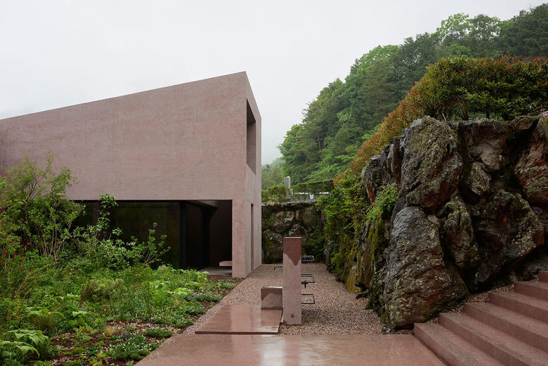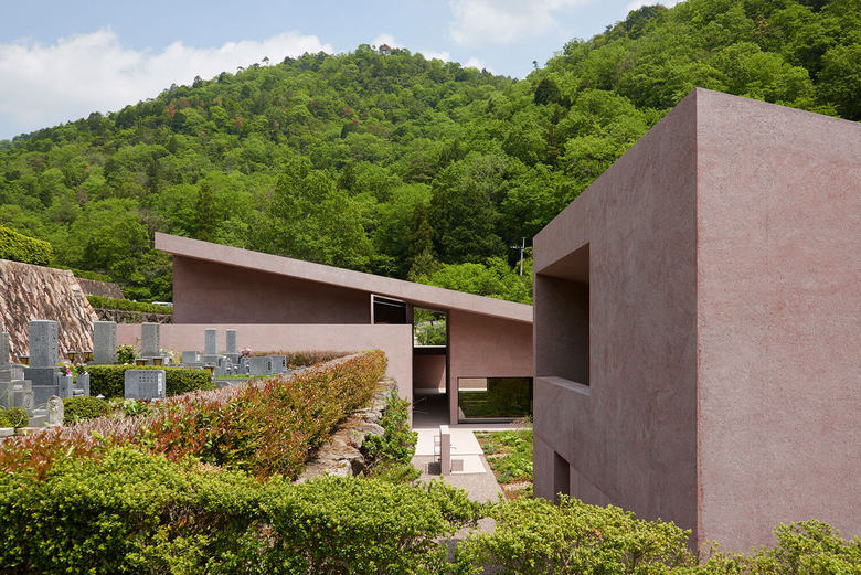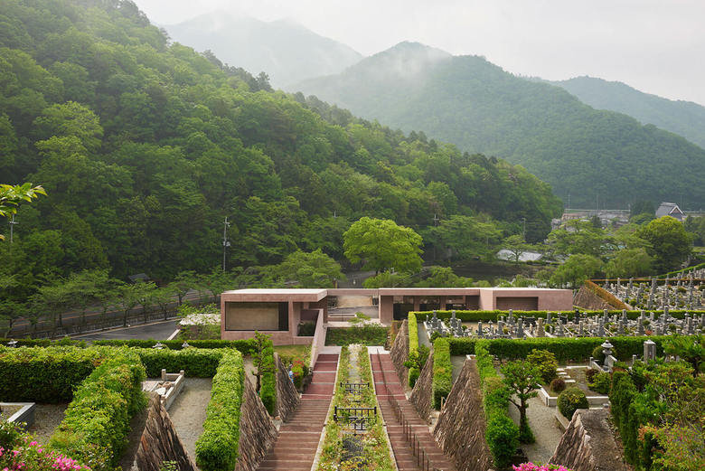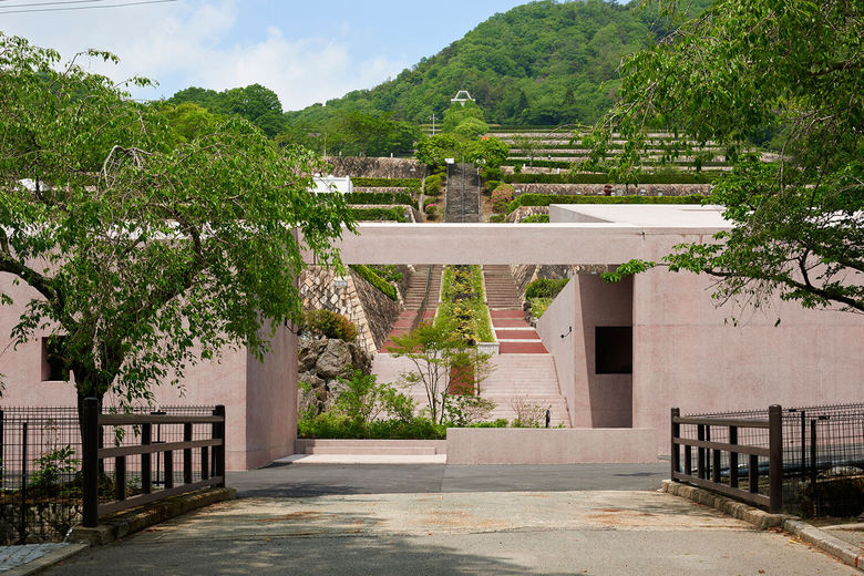 Inagawa Cemetery is located on a steep site in the Hokusetsu Mountain Range of the Hyogo prefecture, approximately 40 kilometres north of Osaka. The cemetery is laid out across terraces and bisected by a monumental flight of steps leading up to a shrine at the highest point – an axis that orients the whole project.